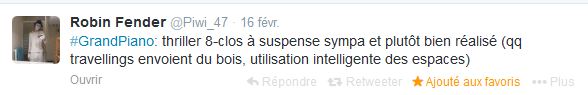 Grand Piano est un long métrage réalisé par l’espagnol Eugenio Mira et produit par Rodrigo Cortés, l’homme à la barre de l’excellent Buried. Composé d’une distribution intéressante (Elijah Wood, John Cusack, Tamsin Egerton), ce thriller sort directement en vidéo dans l’hexagone le 30 avril prochain. Le nouveau film de Eugenio Mira met en scène Elijah Wood dans la peau d’un pianiste de renom, menacé de mort en plein concert. Un pitch assez original, quoique pas tant que ça – souvenez-vous du thriller téléphonique haletant Phone Game de Joel Schumacher, avec Colin Farrell et Kiefer Sutherland – pour un film à suspense prenant et plutôt bien troussé, rendant largement hommage aux maîtres Hitchcock et De Palma.Il faut dire que le spectateur est séduit dès les premières minutes par le jeu de Elijah Wood, qui offre du relief et du charisme à son personnage de musicien talentueux prêt à remonter sur scène après cinq ans d’absence (son trac anxiogène l’avait contraint à stopper sa carrière). Quant à John Cusack, il prête sa voix avec panache au psychopathe qui menace de tuer l’épouse du pianiste. En somme, des interprètes pas forcément au sommet, mais bien investis et donnant crédit à l’entreprise. Rythmé par des notes de piano angoissantes (gros travail sur la musique, personnage à part entière), Grand Piano tient en haleine pendant une grosse heure, enchaînant des images inquiétantes, avec une tension qui monte crescendo. Une première partie maîtrisée, marquée par de nombreux clins d’œil aux œuvres des senseï – Alfred Hitchcock of course (L’homme qui en savait trop et la scène du concert), mais aussi Luis Bunuel (Un Chien andalou), avec ce plan d’une femme égorgée tandis qu’un violoncelliste fait glisser son archet sur son instrument, ou encore Brian De Palma, avec un point de vue formel intéressant où Eugenio Mira semble exorciser quelques envies visuelles assez folles (travellings en veux-tu, en voilà, plans au steadycam, emploi intelligent des espaces de la salle …), toujours sur le fil d’une mise en scène tape à l’œil. Quel dommage par contre que le film soit plombé par un dernier acte lambda (comprenez impersonnel) assez maladroit, amorcé à la minute où est révélée l’identité du maître chanteur. Au-delà des motivations très douteuses du bad guy et d’une résolution un peu facile, Grand Piano sombre hélas dans la banalité, tant sur un plan visuel que narratif. En résumé, Grand Piano est un thriller en huis-clos prenant, façon jeu du chat et de la souris virtuose, porté par des comédiens en forme et des influences bien digérées, qui est malheureusement gâché par une fin faiblarde.