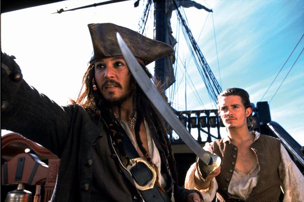 Les antagonistes sont légions, personne ne se fiant à personne dans cette région du globe. Les alliances se font et se défont à une cadence effrénée, autour d’un duel de titans déjà cultes après une heure de pelloche : Hector Barbossa (Geoffrey Rush) vs. (le capitaine) Jack Sparrow (Johnny Depp). Depp y a d’ailleurs sans doute trouvé le rôle le plus iconique de sa carrière – pourtant éclectique – en façonnant à partir d’une simple ébauche le plus chancelant et le plus attachant des pirates incarnés au grand écran, tout madré qu’il soit. Un rôle taillé sur mesure, dans lequel se côtoient la folie et le génie, véritable garant du succès insolent de la franchise. Arguer que tout repose sur le seul personnage de Sparrow serait cependant erroné. Car Pirates des Caraïbes, c’est une pléiade de personnages qui composent de manière très ludique un véritable film de bande(s). A commencer par les sidekicks de Jack Sparrow, Will Turner (Orlando Bloom) et Elizabeth Swann (Keira Knightley), candidats à une belle romance, de ces romances qui marquent les plus grands films, quoique sans cesse « piratée ». On pourra dire ce que l’on veut, que Bloom joue trop de ses sourcils ou que Keira campe une foutue rabat-joie parfois hystérique (comprendre femme à poigne), la romance est belle, et leur couple est définitivement entré dans l’histoire. A la poursuite des pirates, Jack Davenport incarne un commodore Norrington impérial, tandis que Jonathan Pryce amuse par ses facéties de gouverneur pas assez confronté au monde. Enfin, le duo à la Laurel et Hardy, Pintel et Ragetti (Lee Arenberg et Mackenzie Crook) concentre à lui seul quelques-unes des scènes les plus hilarantes du film.
