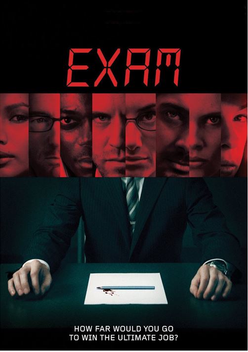 « 80 minutes. 8 candidats. 1 seule réponse. Pas de question. » Non, ça n’est pas le concept d’un nouveau jeu racoleur sur TF1, mais celui du film Exam de Stuart Hazeldine. Un collègue m’en a fait l’article il y a deux ou trois ans de ça – comme le temps passe vite ! – en me vendant le truc à mort : « c’est pas avec des gens connus, en tous cas moi je les connais pas, mais le concept est super original, l’intrigue est dingue, jusqu’à la dernière minute tu comprends rien, ça m’a retourné le cerveau ! « … A peu de choses près. Chauffée à bloc, n’y tenant plus trois ans après, j’ai enfin libéré le dvd de son emballage et visionné le bestiau. Verdict : bah c’est pas mal. Clairement pas aussi transcendant que ce que vante la jaquette du dvd ou mon collègue un peu trop enthousiaste, mais ça se regarde avec intérêt. En tous cas au début. La tension instaurée dans les premières minutes est hyper efficace. Mais cette tension, qui tend pourtant à amplifier à mesure que le film approche de son dénouement, se délite assez inexplicablement, avec un final maladroit, presque brouillon, alourdi d’un décor extérieur planté trop hasardeusement et d’une explication qui en laissera plus d’un perplexe. Sans doute que, contrairement à mon collègue, j’ai déjà vu plus fort et mieux dans le genre, plus vicelard aussi. Exam reste un huis-clos honorable, à l’ambiance soignée, portée par une galerie de personnages volontairement stéréotypés comme autant d’ingrédients parfaits rangés à côté de la marmite de Panoramix. Mais la potion manque d’un je-ne-sais-quoi pour être franchement magique.