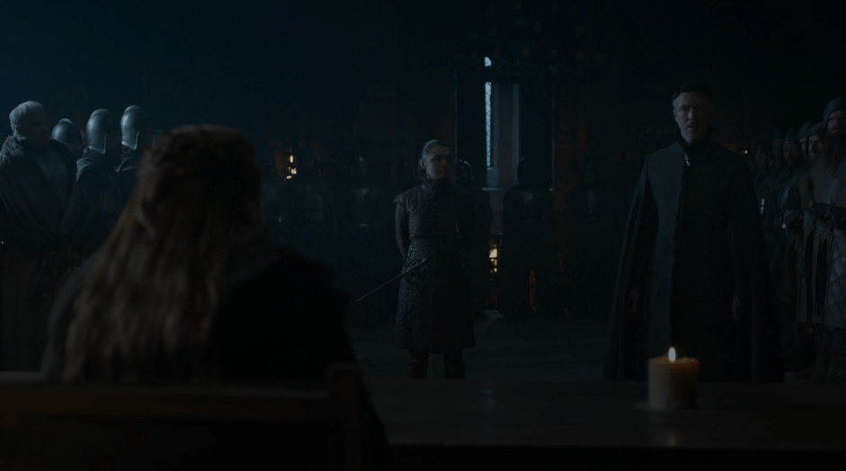 A Winterfell, Littlefinger poursuit son travail de sape auprès de Sansa, qu’il aimerait monter contre sa sœur, afin, on l’imagine, d’avoir les coudées franches pour la suite de son plan, que l’on suppose être tuer tout le monde pour conquérir le Trône de Fer. Les choses semblent fonctionner, puisque Sansa convoque Arya à un conseil qui semble plus que préparé à des effusions de sang. Des dizaines de soldats armés sont là, Sansa et Bran sont assis derrière une table type tribunal, le tout sous une lumière faible, qui permet à Littlefinger, présent, de continuer à s’adosser à un mur et à laisser la moitié de son visage dans l’obscurité. Imaginez donc la surprise du bonhomme lorsqu’il est interpellé par la Dame de Winterfell pour répondre des accusations de meurtre et de trahison à son encontre qui sont, somme toute, le point de départ de la guerre entre les Stark et les Lannister. Le pauvre n’a pas vraiment de défense à faire valoir, puisque Bran se permet de lui rappeler quelques moments clés de son passé, que lui seul pourrait connaître. Lord Baelish s’effondre, pleure, supplie, dans un moment légèrement dégradant dont viendra heureusement nous sauver Arya, en égorgeant d’un éclair le traitre. A Winterfell, tout est donc enfin prêt pour la dernière saison de Game of Thrones, Bran, Sansa et Arya étant sur la même longueur d’onde avant le retour tant attendu de Jon, en route pour le Nord.