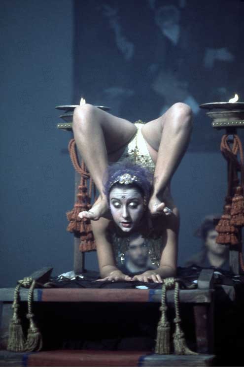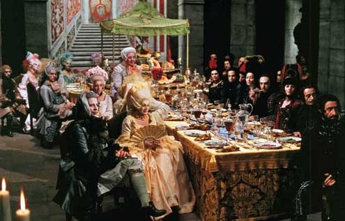 Esclave d’un désir sexuel et orgiaque sans limites, Casanova ne sera donc ici qu’une machine sexuelle pathétique, à la fois pantin du monde qui l’entoure et pantin de son propre sexe qui le privera de toute forme d’épanouissement. On en prend déjà le pouls dans une scène d’introduction qui, juste après un carnaval vénitien virant à la cérémonie païenne, montre Casanova se livrant à des actes érotiques avec l’amante de l’ambassadeur de France (et sous les yeux consentants de celui-ci !). Tout est déjà là : un Casanova prétendument transgressif qui ne se révèle être qu’un pantin gesticulant sous le regard de ses « maîtres », un intellectuel pédant et sans charisme dont la seule récompense se limite à endurer l’indifférence de ses pairs, un univers baroque où l’excès et la démesure peinent à dissimuler le côté froid et désenchanté de l’époque. Il serait un peu trop facile de croire que les conflits survenus durant son tournage ont dépeint sur le ton général du film jusqu’à l’assombrir, mais comment passer outre ce détail capital ? Sans raffinement ni véritable « beauté », Fellini tourne majoritairement son film dans des lieux exigus et peu éclairés, déroule une ambiance pesante où chaque début de fête ressemble à du surplace sans finalité, intensifie la laideur et la déformation des faciès par des maquillages outranciers, rend écœurant le déferlement de motifs et de sons répétitifs (la BO électronique de Nino Rota tape vite sur le système !), et va même jusqu’à utiliser des sacs poubelle agités par des ventilateurs pour figurer l’océan (un effet pseudo-poétique qui tombe complètement à plat !). Non pas le tableau d’une époque à retranscrire telle quelle, mais un dégoût profond pour cette époque qui déteint de ce fait sur elle jusqu’à en brouiller – voire à en trahir – l’idée même de représentation.