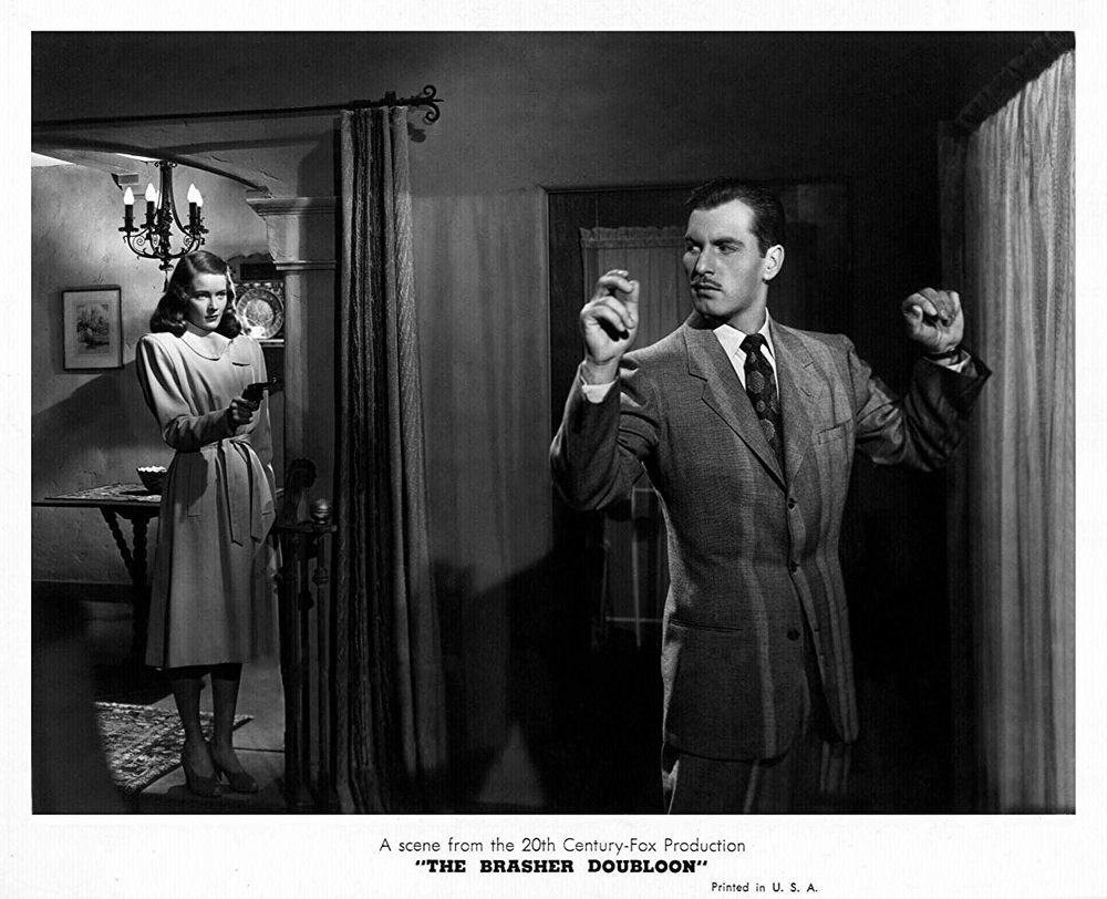 Cette adaptation de The Brasher Doubloon (La Pièce Maudite en français) reprend la figure du personnage de Marlowe, personnage antipathique, séducteur, assez outrancier. A l’image de The Big Sleep, Marlowe va à l’encontre d’une famille richissime dont on ressent la cupidité et l’oisiveté dès les premiers plans. Paradoxalement, le célèbre détective privé traine dans un milieu qu’il semble exécré, cette Amérique qui allie les riches et les mafieux. La scène d’ouverture reprend également la visite de Bogart dans cette immense maison. On observe très rapidement que George Montgomery n’a malheureusement pas la même présence que Bogart dans le film d’Howard Hawks. Cet acteur n’a d’ailleurs pas marqué le cinéma des années 40-50. Malgré un côté charmant indéniable, on ne ressent pas le côté agressif et sombre de Marlowe. De même, l’actrice Nancy Guild qui interprète la secrétaire dérangée n’arrive pas à transmettre autant d’émotion que Lauren Bacall.