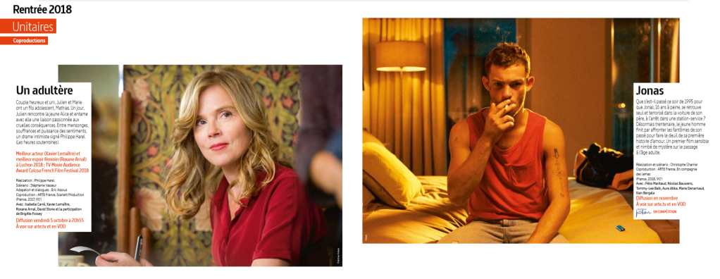 Enfin les séries et les unitaires – dont certains seront dévoilés lors du 20 ème Festival de la Fiction TV de la Rochelle – l’offre de la chaine est extrêmement alléchante de Ad Vitam (de Thomas Cailley avec Yvan Attal, Garance Marillier, Niels Schneider et Rod Paradot) en passant par Thanksgiving de Nicolas Saada avec Grégoire Colin (diffusion en novembre), Jeux d’influence de Jean-Xavier de Lestrade avec Alix Poisson et Laurent Stocker ou côté unitaires Un adultère de Philippe Harel avec Isabelle Carré ou Jonas de Christophe Charrier avec Félix Maritaud. Pour 2019, on attend aussi Il était une seconde fois de Guillaume Nicloux avec Gaspard Ulliel ou Une vie après avec Emilie Dequenne et Frédéric Pierrot.