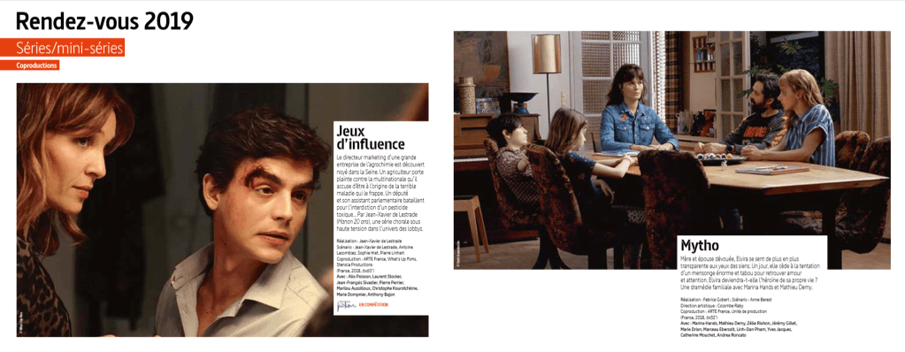 Par ailleurs la chaine franco-allemande a « noué cette année de nouveaux partenariats: avec l’Allemagne pour Eden, l’Espagne pour Hierro et l’Italie pour Il Miracolo, du romancier à succès Niccolò Ammaniti » tout en étant toujours très présent auprès de la Scandinavie (notamment avec Au nom du père – Ride Upon the Storm d’Adam Price)