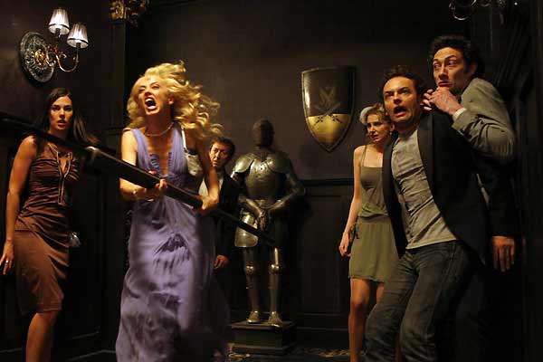 Rappelant vaguement celle des Morsures de l’aube d’Antoine de Caunes, l’histoire est ici un banal prétexte. En gros, une bande de fêtards passés maîtres dans l’art de taper l’incruste dans des soirées hype pour y jouer les pique-assiettes se retrouvent un jour piégés dans un luxueux château, peuplé de vampires qui souhaitent en faire leur buffet. Rien de bien extraordinaire, donc, et à vrai dire, pas non plus de quoi transcender un pitch de sitcom KD2A où seule compte l’envie de caser de la blagounette kikoolol dans un cadre pseudo-fantastique. C’est surtout l’humilité des deux réalisateurs qui se révèle rafraichissante. Avec un casting riche en gueules (on en repère une poignée qui trustait quelques-unes des meilleures scènes de La Cité de la peur) et un budget très confortable de 5,5 millions d’euros (même nos films d’horreur français n’ont pas la moitié de ça !), Lobelle & Cafiero auront fait le choix de faire tanguer davantage leur pur film d’horreur vers le rire, sans pour autant faire preuve de cynisme ou de condescendance vis-à-vis du genre exploré. Ceci explique sans doute pourquoi la plus grande qualité de ce premier film reste sa mise en scène. Entre un décorum chiadé, des effets spéciaux parfaits et des maquillages constamment crédibles, la faculté des réalisateurs à construire un univers tangible et jamais cheap force le respect, surtout avec un budget aussi réduit. Le jeu sur les échelles de plan et un joli nombre de trouvailles visuelles bien senties (mention spéciale à ce vampire dont les dents pointues sont sans cesse cachées par le bras d’un serveur) offrent ici une efficacité et un dynamisme qui tranche avec le néant créatif de nos comédies franchouillardes torchées vite fait mal fait par (et pour) la télé.
