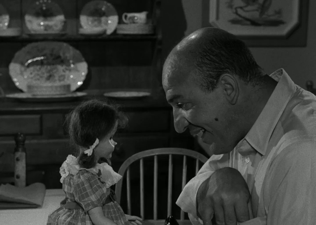 En 2 minutes, le temps du court prologue qui précède le monologue habituel de Ron Serling, le cadre de cet épisode est parfaitement posé. Telly Savalas (Erich) est un beau-père autoritaire dépassé par la demande d’affection de sa petite fille, enfermé dans ses principes et incapable de trouver sa place dans cette famille pourtant en apparence aimante et qui ne demande qu’à l’intégrer. L’achat de cette poupée va déclencher sa colère et une vive dispute avec son épouse, alors même qu’il ignore encore les tourments que va lui causer Tina. Cet épisode est à nos yeux particulièrement représentatif de ce qui constitue l’ADN de la série et fait que ses épisodes ont autant d’impact sur nous. En les confrontant à un événement extraordinaire, en les sortant de leur réalité, les épisodes de The Twilight Zone sondent les âmes et les cœurs de ses personnages. L’argument fantastique ou de science fiction est là pour révéler leur véritable nature. S’ils sont seuls dans la réalité alternative dans laquelle ils sont projetés, que ceux qui les entourent ne connaissent pas la cause véritable de leur panique et que personne ne les entend donc véritablement, tout le monde les entendra penser, verra éclater tout ce que le vernis social venait jusqu’alors recouvrir, toutes les peurs enfouies qu’ils tentent d’étouffer.