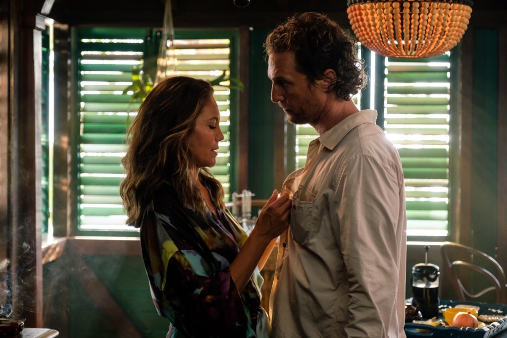 Dans son exposition, Serenity nous convainc à condition de prendre ce récit un peu au second degré. Cette histoire vue et revue d’une femme fatale qui demande « un service » à son ex-compagnon, en l’occurrence tuer son mari est ici traitée de manière grossière mais ne dépasse pas le stade de la caricature ce qui permet d’y prendre un malin plaisir. En effet, les décors sont paradisiaques, les corps sont sculptés, McCo et son accent texan sont de sortis, les cigarettes s’allument à une vitesse record et le mari est un salaud violent et irrécupérable. A ce moment du film, on est plus dans le petit polar du samedi soir, une version cheap de La Fièvre au Corps, qui peut nous convenir à condition d’être bien luné. On a l’impression que chacun est venu prendre son petit chèque pour passer un bon moment sur un tournage à l’autre bout du monde. Ainsi, McConaughey nous fait la spéciale dépressif avec ses monologues assez vides de sens. Ces fameux monologues nous avaient impressionnés il y a maintenant 5 ans dans True Detective mais deviennent ici redondants. Avec son talent inné, Anne Hattaway aurait pu faire monter la température dans ce rôle de femme violentée et prête à tout pour parvenir à ses fins mais elle est trop mal dirigée pour avoir le commencement d’une tension lorsqu’elle apparait à l’écran.