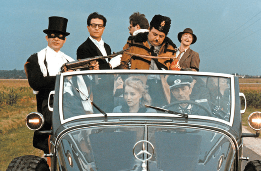 Car le film parodie les précédentes œuvres cinématographiques parlant de la Résistance. On pense à l’incroyable La Vie de château (1966) de Jean-Paul Rappeneau (une grande maison de famille réquisitionnée par les Allemands), mais surtout au classique de la comédie La Grande Vadrouille de Gérard Oury (1966), avec Bourvil et Louis de Funès. Le film est d’ailleurs dédié à ce dernier. En effet, il était question que l’acteur incarne Papy (joué par Michel Galabru) puis le demi-frère d’Hitler (finalement interprété par Jacques Villeret) mais malheureusement il meurt avant le tournage. On peut percevoir l’hommage qu’est le film de Poiré à La Grande Vadrouille, et en même temps on ne peut s’empêcher de penser qu’il est aussi un pied de nez à ces longs-métrages célébrant la résistance française, où tous les Français de cette époque étaient bien sûr résistants. Ces films participaient au mythe résistancialiste, développé par De Gaulle, c’est-à-dire une résistance française naturelle et unanime ayant débutée dès le début de la Seconde Guerre Mondiale. A partir des années 1970, ce mythe est démonté, plus particulièrement grâce au célèbre documentaire de Marcel Ophuls : Le chagrin et la pitié (tourné en 1969 et sorti au cinéma en 1971) qui parle de la collaboration de ces « années noires ». Puis le téléfilm Au Bon Beurre (1981) d’Edouard Molinaro marque les esprits en prenant le sujet de la collaboration et du marché noir à bras le corps (la télévision continuera à explorer cette période compliquée avec l’excellente série Un Village Français (2009-2017) qu’on vous recommande). Et vient ce fameux Papy fait de la résistance qui joue constamment sur cette ambiguïté.