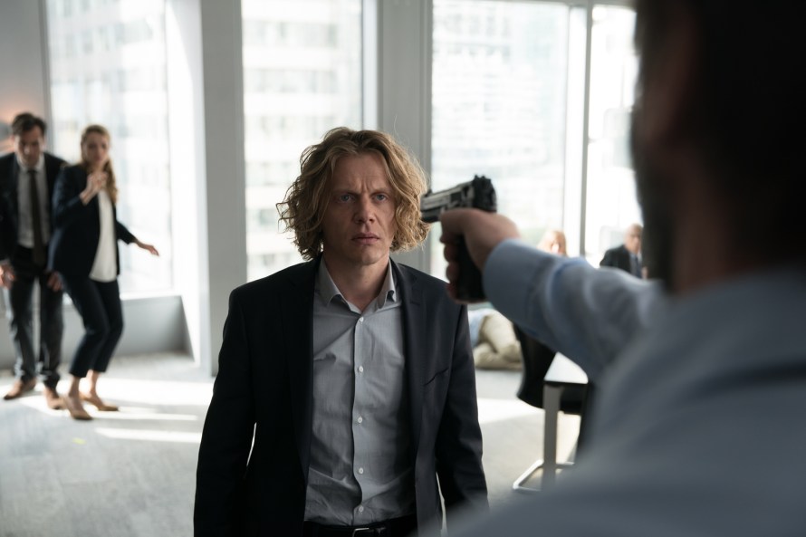 Pour cela la série va adopter deux points de vue : celui d’un Eric Cantona affublé d’un look de taulard qui s’adresse directement au spectateur face caméra afin d’expliquer un peu ses états d’âme, et celui beaucoup plus classique des événements qui l’ont mené en prison, ainsi que ceux qui suivront. Nous ne pouvons pas dire que nous ayons été particulièrement emballés par le premier parti pris, celui des passages face caméra, heureusement minoritaires : déjà ils cassent toute surprise en nous présentant d’emblée un Alain Delambre en cellule et physiquement métamorphosé (bien que cela nous rende certes curieux de voir comment il en est arrivé là), ensuite ils manquent vraiment de spontanéité, enfin ils prennent un aspect « manifeste » assez maladroit alors même que la partie plus classique de l’histoire va largement nous démontrer que bien que nous puissions comprendre les raisons du pétage de plombs du personnage principal, cela n’excusera pas pour autant ses agissements. Le reste de l’histoire est donc heureusement mieux maîtrisé que ces passages épisodiques. Les trois premiers épisodes sont probablement les plus intéressants car il mettent en leur cœur un arc assez excitant : Alain Delambre, chômeur en fin de droits, désabusé et déprimé décroche enfin un entretien d’embauche, assorti d’un test, dans une grande entreprise. Le test s’avère malheureusement particulièrement immoral et périlleux car il consiste en la participation à une prise d’otages fictive où Alain va devoir réussir à être le meilleur au cours de l’interrogatoire d’employés qui ignorent tout du caractère factice du coup d’éclat ; quitte à ce qu’ils finissent tous traumatisés. Ainsi débutera le chavirement, qui sera plus complexe que ce que nous venons d’exposer, mais nous préférons vous conserver la surprise. Au centre des personnages il y a Alex Lutz qui incarne le Président de l’entreprise où Alain souhaite être recruté ; celui qui avait raflé un César pour l’excellent et touchant, mais trop confidentiel, Guy, excelle dans ce rôle. Chacune de ses apparitions en tant que tête pensante est savoureuse, Alex Lutz étant physiquement et oralement la personne idéale pour incarner ce manager froid, éloquent, charismatique, dénué d’affect mais pourtant tellement agréable à écouter. Suzanne Clément joue quant à elle Nicole, l’épouse d’Alain Delambre ; bien qu’elle serve un peu trop de faire-valoir vers la fin de la série, le spectateur comprend tout à fait le poids qui pèse sur ses épaules et éprouve davantage d’empathie envers elle que pour son mari. Un personnage féminin au développement intéressant et logique, plus facile à appréhender que celui du borderline Alain. Gustave Kervern est quant à lui Charles, le meilleur ami d’Alain, petit génie de l’informatique qui va lui être d’un secours indispensable du début à la fin. Si l’ensemble n’est pas forcément toujours très crédible, avec des rouages de temps à autre un peu gros, la série dispose d’un excellent rythme, de plusieurs moments particulièrement palpitants (le déroulement de la prise d’otages, la prison etc.) et ce jusqu’à sa conclusion. Mieux encore, en s’attardant sur le parcours évolutif d’Alain Delambre, la série balaie plusieurs angles de ses dérapages : le pan social oui, mais aussi familial, carcéral, médiatique et judiciaire, ce qui donne quelque chose de finalement assez dense.