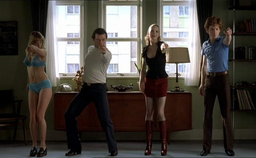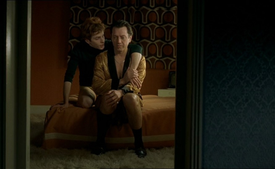 D’abord les points forts, tout de même. Très proche de la farce et très éloigné du réalisme, Gouttes d’eau sur pierres brûlantes vise très juste dans son tableau d’une smala que l’on sent toujours bloquée au stade de l’enfance, l’artifice ambiant et l’idéal infantile n’étant ici que les signes d’une atroce impossibilité à grandir. Les signes sont partout : avec leur appartement inondé de totems 70’s, leur garde-robe tirée à quatre épingles et leurs habitudes du quotidien (on fait des goûters d’enfant, on joue aux petits chevaux, on danse comme Claude François, etc…), les personnages ressemblent à des Playmobil que le cinéaste fait s’agiter dans un intérieur assimilable à une maison de poupées. Incarné par un Bernard Giraudeau dont l’interprétation sidérante mériterait un paragraphe entier, le personnage de Léopold, regard corrosif et tempérament incisif, n’est au fond qu’un gamin ayant revêtu la panoplie d’un dictateur, régnant sur son petit cocon totalement coupé du monde extérieur. Et la fantaisie qui s’y joue peine toujours plus à cacher ce qui tracasse secrètement chacun des quatre personnages, à savoir une peur terrifiante de la mort que seul le jeu du pouvoir (ou le pouvoir du jeu ?) semble capable de contrer. La bonne idée d’Ozon pour entretenir l’illusion aura d’ailleurs consisté à clore chaque acte du récit – le scénario respecte jusqu’au bout la division de la pièce de théâtre – par un petit rituel dénudé sur fond de berceuse enfantine. Sourire et mélancolie mêlés, regards croisés, deux ou trois plans – pas mal du tout. C’est hélas la seule grande audace de mise en scène dont le cinéaste fait ici preuve.