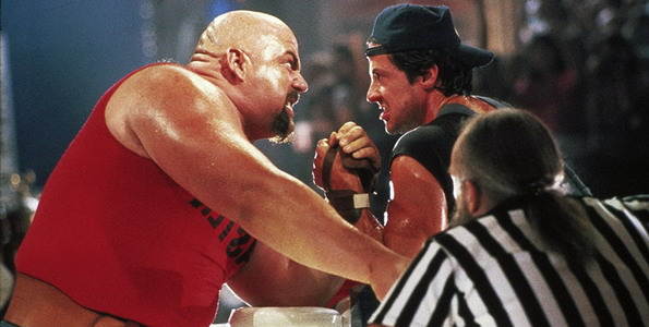 1. (evilashymetrie) Film témoin d’une époque hélas révolue (mais si ça se trouve, les jeunes de vingt ans d’aujourd’hui parleront du cinéma des ’20s de la même façon que nous parlons des ’80s) mais qui pour moi constitue un joli nanar doudou, avec une bonne dose de guimauve, de grimaces rigolotes (notamment la gueule que tire Sly dans le bar quand il va affronter le 1er bad guy) et de musique FM. Mais j’avoue aussi que … ben des combats de bras de fer, franchement, y a rien de moins cinégénique que ça dans un film d’action. Passer de Rambo/Rocky/Cobra à ça… lol