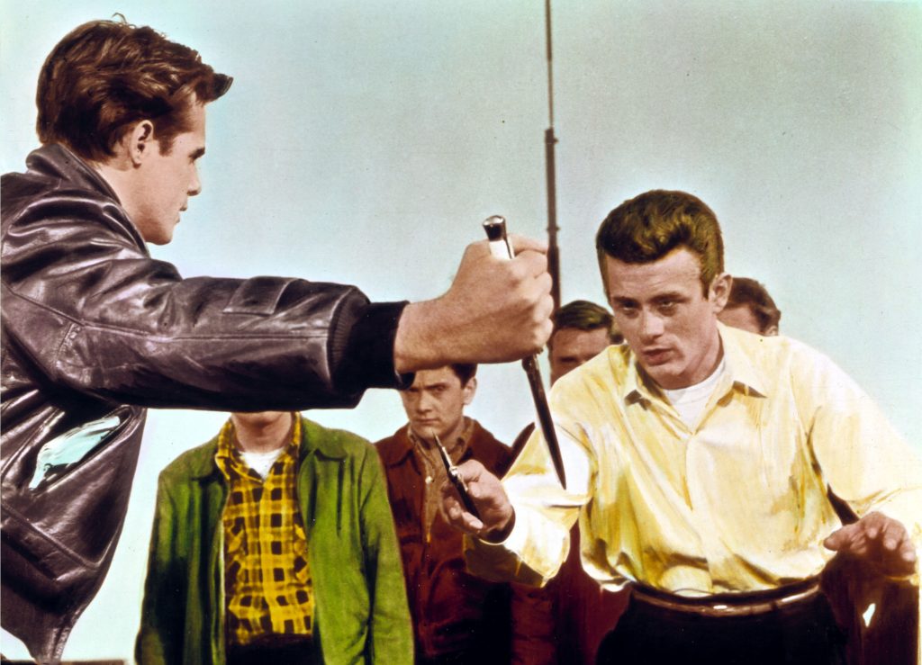 Un rebelle sans cause: le titre original du film de Nicholas Ray qui contribua grandement à la légende de James Dean rend compte d’une des lignes de fracture qui traverse la société américaine des années 50 derrière le storytelling de la super puissance au sommet de son rayonnement culturel et économique, exportant son modèle social dans tout l’occident. Au delà de la fracture raciale sur laquelle les États-Unis continuent d’asseoir un essor économique qui ne profite qu’à une partie de sa population, se dessine une fracture générationnelle entre une partie de sa jeunesse et leurs aînés, impuissants à comprendre le désir de liberté et de changement qui anime ces adolescents qui peuvent grandir dans un monde pacifié. Être adolescent dans l’Amérique des années 50, pour peu que l’on soit né du bon côté de la barrière, offrait des perspectives que n’ont pas eu leurs parents et donc des velléités de remise en cause de l’ordre établi. Ces jeunes sont de fait perçus comme des rebelles sans cause, des mauvaises graines qui ne pensent qu’à eux-mêmes en s’affranchissant de toute obligation vis à vis de leur famille ou leur nation. Au début des années 50, la montée de la violence juvénile occupe de plus en plus de place dans les débats qui agitent la société américaine et Hollywood s’empara bien évidemment du sujet. Le premier film qui marquera les esprits sera L’équipée Sauvage de Laslo Benedek (1953), inspiré des incidents qui éclatèrent quelques années plus tôt dans la petite ville d’Hollister, à l’occasion desquels l’Amérique pris conscience du phénomène de montée de la violence au sein d’une partie de sa jeunesse trouvant dans les gangs de motards une réponse à leur volonté de s’affranchir du poids écrasant des conventions sociales que la précédente génération n’avait pu (en raison du contexte de la guerre mondiale) ou voulu contester. La différence et ce qui confère à nos yeux sa puissance dramatique et sa pertinence au film de Nicholas Ray c’est que les rebelles de La Fureur de Vivre ne sont pas de mauvaises graines vêtues de cuir et déjà sorties finalement du contrat social mais il s’agit de jeunes gens scolarisés, intégrés sur lesquels leurs parents n’ont plus de prise. Le récit est ramassé sur une journée et deux nuits durant lesquelles les destins de Jim (James Dean), Plato (Sal Mineo) et Judy (Natalie Wood) vont se croiser pour le meilleur et pour le pire. Amitié, amour, violence, ces 24 heures vont bouleverser leur vie et parachever leur passage vers l’age adulte.