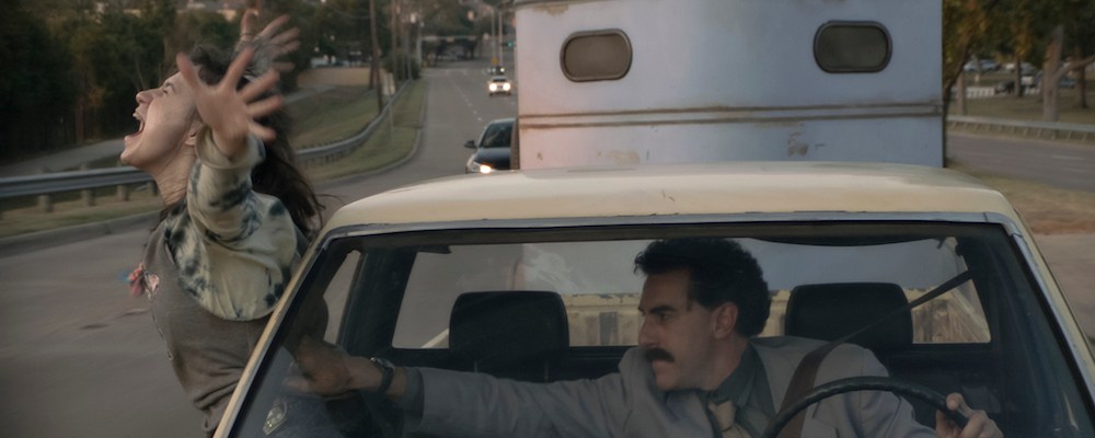 Il y a 15 ans, avec Borat, derrière la farce et les outrances presque sans limites de son personnage, le fantasque Sacha Baron Cohen avait réussi un petit tour de force et rappelé à quel point la satire est un art précieux qui a toujours su, à travers les siècles, poser un regard aussi féroce que juste sur les travers de nos sociétés. A travers les yeux et le parcours rocambolesque d’un journaliste Kazakh envoyé en reportage par sa chaine de télévision, plus concerné par sa quête de l’amour de Pamela « CJ » Anderson, que par celle de la compréhension profonde de ce pays qu’il traverse d’Est en Ouest, Borat nous en disait déjà beaucoup sur les mœurs de ce pays dans lequel on trouvait en germe tous les maux qui allaient mener, 10 ans plus tard, à l’élection de Donald Trump. Transparaissait déjà la fracture entre les élites bien pensantes de la côte Est, choquées par le discours misogyne, homophobe, antisémite de Borat et toute une partie de l’Amérique figée dans le temps, nostalgique de son passé, sourde aux revendications des minorités perçues comme autant de coups de canifs au sacro-saint patriotisme. L’absence de réaction aux propos de Borat et parfois même, chez ceux qui se sentaient alors en confiance avec quelqu’un pensant comme eux, l’expression d’une idéologie ouvertement raciste et homophobe valait plus que tous les mots. Elle en disait déjà plus que les grands discours, mise en garde ou essais sur ce qui était en train de monter en Amérique et que l’élection de Barack Obama, 2 ans plus tard, puis son échec à parler à cette « Amérique du milieu » n’allait faire que renforcer. De Trump, il n’en était pas encore explicitement question, sauf au détour d’une très courte scène dans laquelle on apercevait Borat faire la grosse commission sur le parvis de la célèbre tour de celui qui n’était qu’alors qu’un milliardaire has been voulant désespérément exister par le biais de son émission de télé réalité. Si le propos politique du 1er voyage de Borat aux USA apparaissait sous les habits de la farce orchestrée et jouée par celui qui se cachait auparavant derrière le personnage de Ali G, ce second voyage prend d’avantage des aspects de manifeste politique, très habile, orchestré dans un récit plus scénarisé qui jusque dans chacune de ses outrances renvoie à l’état actuel de la société américaine et aux valeurs morales de ceux qui se sont fait élire pour redonner sa grandeur à l’Amérique.