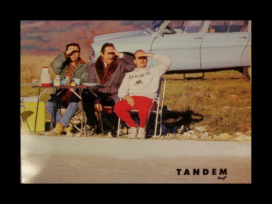 Cependant, tout n’est pas rose et la conception de l’affiche notamment reste un très mauvais souvenir pour le réalisateur qui ne cache pas son désamour pour ce visuel: « Je déteste l’affiche du film, c’est la plus moche que j’ai jamais eue. Elle est opaque, n’exprime rien. Moi, je rêvais d’une affiche avec une route, une voiture, un ciel dégradé, de l’espace, et là elle est renfermée, mise en scène par un concepteur photographe : je la trouve vraiment affreuse, absolument pas à l’image du film. Mais je n’ai rien pu faire. C’est dur les affiches : je me suis souvent révolté, mais j’ai presque tout le temps perdu…. » Heureusement, l’accueil du film est excellent et va même au-delà des espérances du réalisateur : Ça a été un film rentable car il a coûté très peu cher. Mais il est perçu comme un film qui a marché. La réputation des films est souvent plus importante que la réalité des chiffres…. Tandem est mon premier film vraiment personnel… Tandem exprime des choses à moi et je les mets en scène à ma manière. Je ne m’étais jamais donné la possibilité de faire cela. Mais je n’ai jamais cru que j’allais gagner des galons avec ça. » Patrice Leconte reconnait d’ailleurs que dans le film plusieurs de ses fantaisies personnelles apparaissent: » J’aime bien les lignes de fuite du goudron, les sandwichs triangulaires… » Considéré comme l’une des œuvres maitresses du réalisateur, le film gagne une aura culte qui ne se démentira jamais. Jean Rochefort y trouve un de ses plus beaux rôles, sans cesse sur le fil entre extravagance et pathétique tandis que Gérard Jugnot y déploie des trésors d’humanité grâce à une justesse rare. Leconte réussit un film qui semble fragile de prime abord mais qui lui ouvrira des perspectives infinies pour faire un cinéma différent et singulier et c’est sans doute lui qui en parle le mieux: « Tandem est tel que je le voulais… on a tous adoré faire ce film. Jamais je ne retrouverai une telle entente et un tel bonheur de travailler ensemble. Ce film est l’histoire de deux solitudes qui n’arrivent pas à se séparer sans se sentir perdues… »