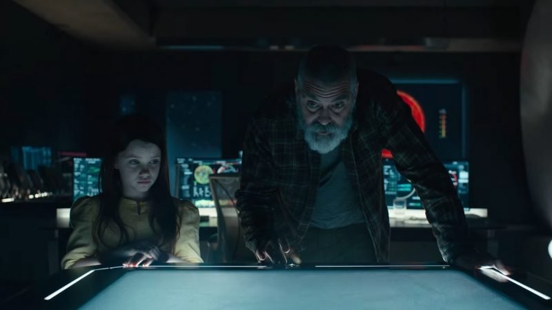The Midnight Sky embarque une cargaison bien trop lourde pour le pilote Georges Clooney qui à force de coups de volants, de changements de direction, pour le maintenir sur la route, d’accélérations mal venues et mal maitrisées, finit par rendre ce voyage éprouvant au delà de l’ennui poli qu’il suscite la plupart du temps. Entre drame existentialiste, film post apocalyptique, film d’exploration spatiale, Clooney à vouloir embrasser trop de genres, se raccrocher à trop de films, se placer dans le sillon de trop de réalisateurs, ne va réellement nulle part et donne le désagréable sentiment que son film n’a aucune colonne vertébrale. On pense évidemment à Gravity mais aussi au court métrage du fils Cuaron, à Silent Running, Interstellar, The Revenant… On pourrait continuer à égrener la liste des références ce qui n’aurait finalement d’autre sens que de montrer que l’on se sent bien peu concerné par ce récit et la façon dont Clooney l’a emballé avec manifestement une idée, une vision que l’on ne retrouve pas à l’écran. Rien ne prend vraiment, rien ne pèse suffisamment pour nous impliquer dans ces deux trames narratives (sur terre / dans l’espace) qui sont censées dialoguer et se rejoindre. On voudrait se rattacher à la relation entre Augustine et Iris (Caoilinnn Springall) qui devrait être le point d’ancrage du film mais elle n’est esquissée. Quelques beaux moments trop fugaces nous rattrapent par le col mais nous font surtout projeter ce qu’aurait pu être le film et renforcent le sentiment que tout n’est qu’effleuré, esquissé, voire artificiel. Les courts flashbacks sont de ce point de vue inutiles et même gênants s’agissant du choix fait de faire appel à un autre acteur, peu ressemblant, pour interpréter Augustine.