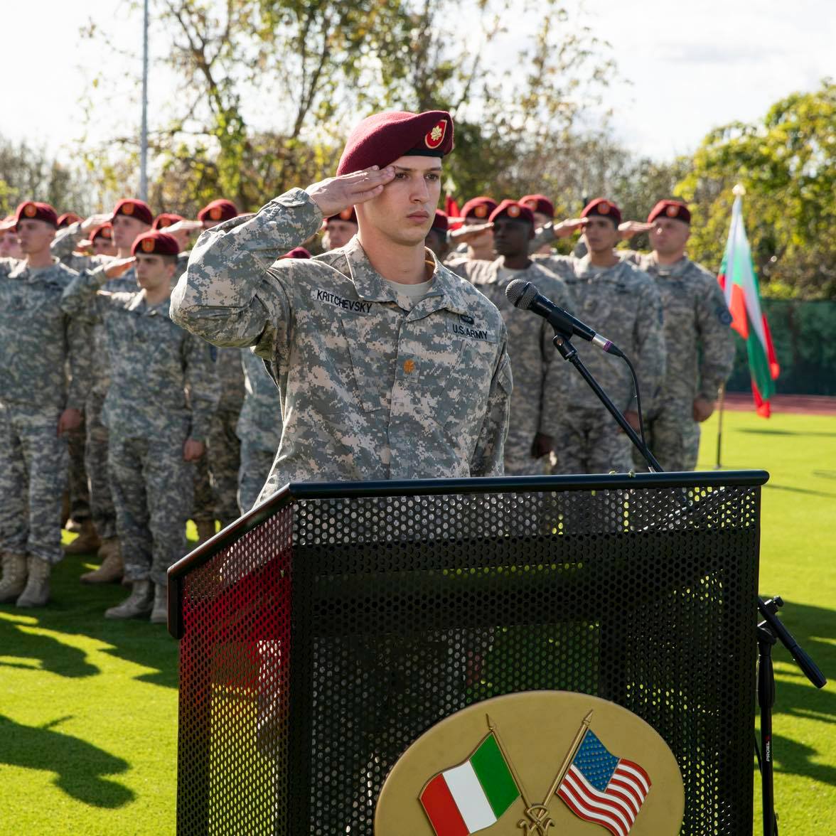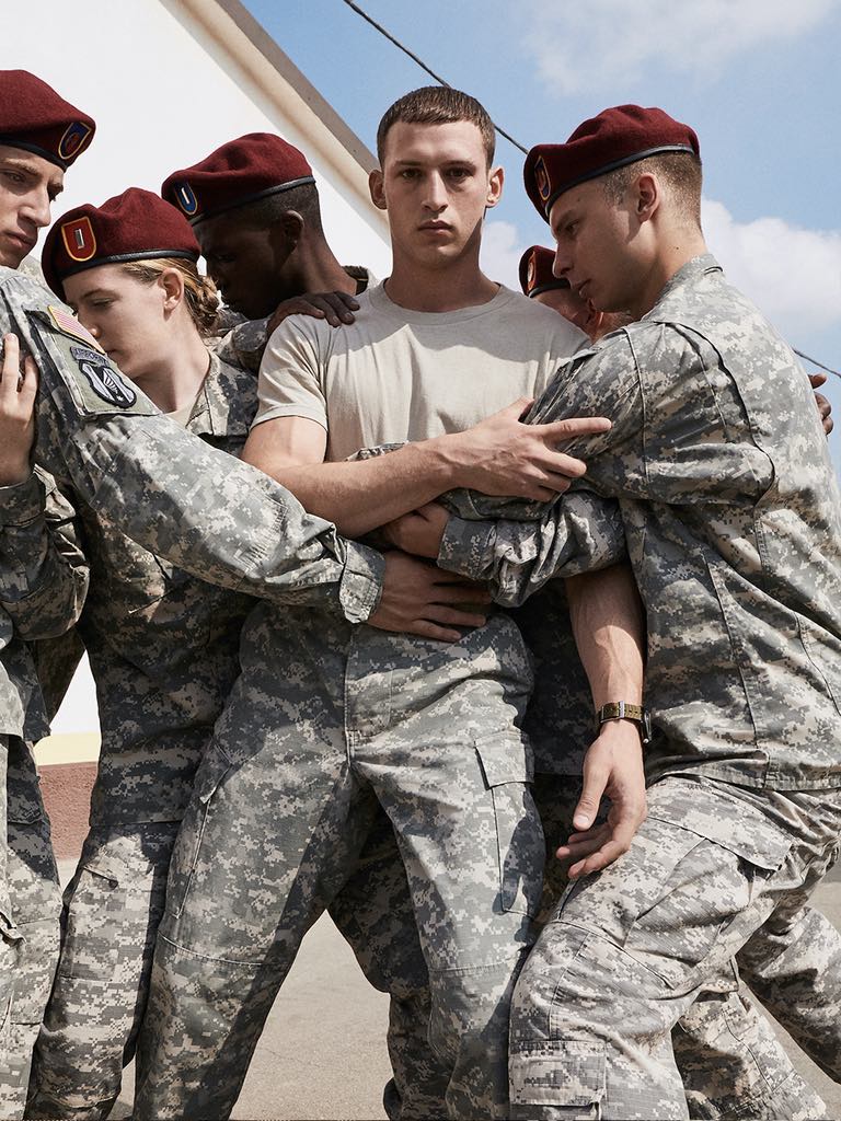 Ce qui était bien avec cette rencontre, c’est que Luca te donne la liberté d’être qui tu es. Alors que je lui disais tout ce qui pouvait ne pas lui donner envie de me prendre pour ce rôle, il m’a justement répondu qu’il me choisissait parce que je n’avais pas l’expérience préalable : je ne savais pas tenir une arme, je ne savais pas tirer. La seule chose que j’adore, c’est le mouvement, la danse. Je pouvais accepter le côté physique d’un rôle militaire, je pouvais l’apprendre mais ce n’était pas quelque chose qui m’attirait personnellement. J’ai appris à tirer sur un stand de tir à Los Angeles, c’était impressionnant de voir cette vie américaine. J’étais très proche de l’entraîneur militaire, Hans Bush (il incarne le colonel McAunty dans la série, NDLR.), qui était notre référent sur le tournage. Il nous montrait comment faire le salut, comment bouger pendant une cérémonie… Il faut entrer dans ce cadre militaire tout en développant les relations avec tous les autres personnages, entre Jonathan et Fraser…