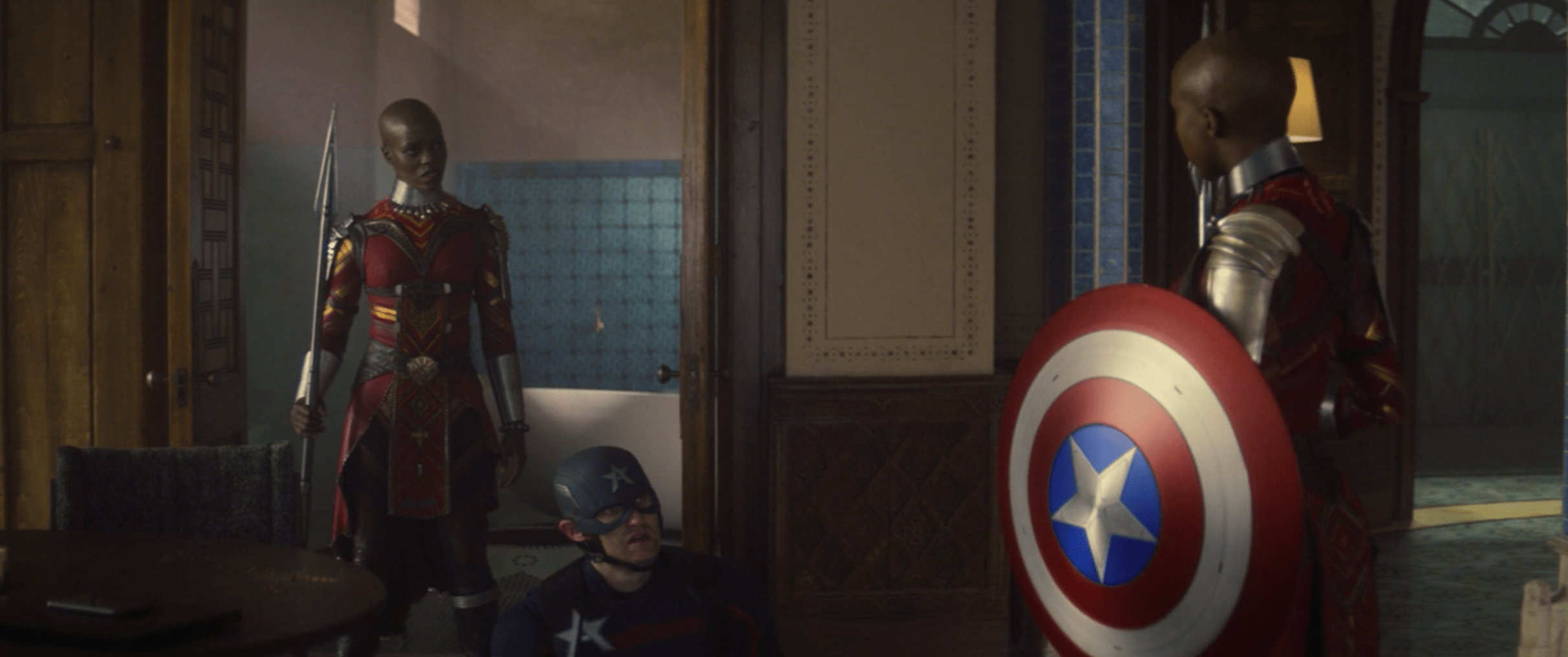 Le point fort de cet épisode est la très belle caractérisation de ses personnages , à travers les échanges entre Sam Wison (Anthony Mackie) et Karli, cette dernière gagnant en humanité et complexité. Quand elle décrit la façon dont Mama Donya l’a accueillie, il est clair qu’elle a un réel besoin d’aider les gens – et lorsque le groupe décrit le monde sans frontières qui existait après le Blip, on en vient même à comprendre la logique tordue du plan de Thanos. Mais elle a sur la conscience la mort de civils innocents et on l’entend menacer la famille de Sam pour l’atteindre. En conséquence, leurs scènes ensemble sont parmi les plus fortes de l’épisode, chacun voulant voir du bien dans l’autre, malgré de nombreuses preuves du contraire. L’idéalisme, le calme et le désir de Sam d’éviter les projecteurs et les conflits sont sans doute les raisons qui l’ont poussé à refuser le bouclier de Captain America mais sa volonté de trouver une solution pacifique montre qu’il est probablement la meilleure personne pour le titre. On ne peut évidemment pas en dire autant de John Walker (Wyatt Russell) dont l’arche narrative semble suivre le chemin le plus logique, épousant celle du personnage des comics en y ajoutant des dimensions psychologiques bienvenues qui en font le personnage central de l’épisode. En dépit de son approche brusque, il est indéniable que Walker est un patriote mais son incapacité à rechercher une solution pacifique en font un handicap pour la mission. Walker est, au fond, un homme en colère, pire il semble souffrir de failles psychologique profondes qui le rendent incapable de gérer le poids de la symbolique du rôle de Captain America. On le savait militaire décoré mais on apprend à travers une conversation avec son partenaire qu’il est toujours hanté par ses actions en Afghanistan et souffre sans doute de stress post-traumatique. De la part de la série c’est un questionnement profond sur ce que peut représenter Captain America dans les années 2020. Steve Rogers a combattu durant la seconde guerre mondiale, sans doute la dernière des guerres menées par les USA avec un prisme moral clair. Mais que représente un soldat qui a combattu dans des conflits aux motivations plus discutables. L’ironie est que si il avait rencontré Sam plus tôt quand ce dernier conseillait des vétérans traumatisés par leur retour de la guerre il aurait été sans doute mieux armé pour la tache. Au lieu de cela ses défaites face aux Dora Milaje et aux Flags-smashers « augmentés » nourrissent son complexe d’infériorité. Quand il se trouve en possession du dernier flacon existant du sérum de supersoldat il est sans doute la dernière personne qui devrait être autorisée à s’en approcher et fait basculer l’épisode dans la tragédie. Le monde nous regarde montre la symétrie entre les deux hommes, c’est parce qu’il doute d’avoir les qualités nécessaires pour incarner Captain America que Sam Wilson est le parfait Captain America et c’est parce qu’il croit mériter de l’incarner que Walker en est indigne. Le fait que Sam soit noir et Walker blanc donne à cette dichotomie un écho de la question de privilège qui secoue la société américaine.
