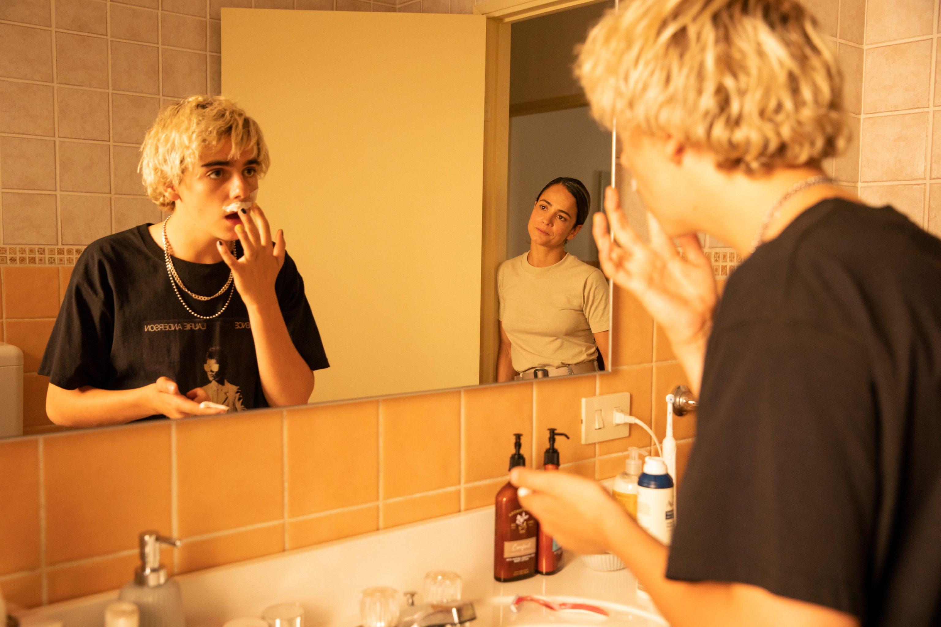 C’est en cela que l’arrivée au pouvoir de Donald Trump, qui s’immisce en toile de fond de la série, est particulièrement pertinente. Il renforce l’idée que tous les personnages, adultes comme adolescents, se trouvent finalement au bord d’un précipice, dans l’inconnu. Pour Sarah, la mère de Fraser, c’est trouver une certaine légitimité en tant que femme militaire et lesbienne, tout en affrontant une relation conflictuelle – quasi incestueuse – avec son fils, qui va jusqu’à la frapper pour une simple histoire de sandwich. Pour Fraser, c’est questionner son rapport au corps, au désir et à son orientation sexuelle : Jonathan (Tom Mercier), l’assistant de sa mère, lui plaît-il malgré une grande différence d’âge ? Caitlin remet en cause son identité au sens large. À travers toute la saison, la jeune fille se demande même si elle en est bien une, ou peut-être un garçon « piégé » dans un corps qui n’est pas le sien. Se pense-t-elle femme cisgenre, homme transgenre, non-binaire ? Là aussi, la question du regard est essentielle : alors que Fraser observe le corps de Jonathan, Caitlin, elle, observe celui de Fraser… Elle se fait parfois appeler Harper, passer pour un garçon, pour flirter avec des filles. C’est à travers la transformation physique de Guadagnino développe davantage son personnage, tandis que celle de Fraser est plutôt psychologique et émotionnelle.