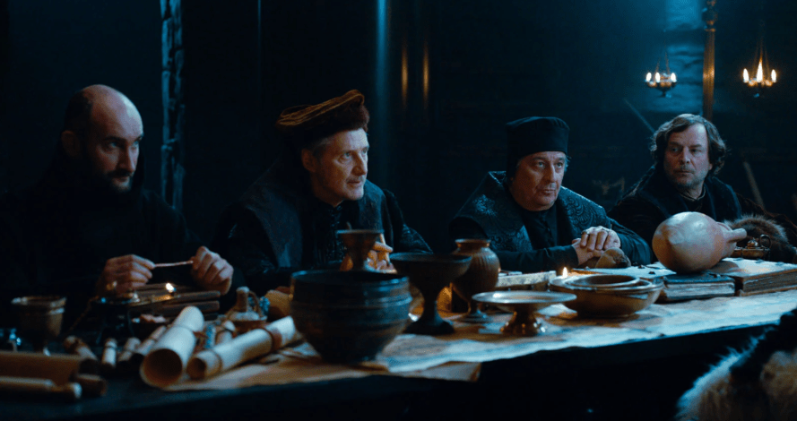 Alexandre Astier l’a répété en interviews, avec ce premier film il veut surprendre et emmener les fans là où ils ne s’y attendent pas. Le créateur a ainsi expliqué à plusieurs reprises que le film était écrit de façon à ce que des personnes n’ayant jamais visionné la série puissent appréhender l’intrigue aisément et a résumé les choses ainsi : « le roi est absent depuis dix ans et il revient pour tout péter ».Ces propos ne se confirment malheureusement qu’assez peu à la vision du film. Oui, Kaamelott – Premier Volet sera facilement compréhensible pour les néophytes puisque l’histoire est effectivement très simple (peut-être trop d’ailleurs). En lançant les hostilités le réalisateur propose de toute façon, à la manière d’un Star Wars, un texte résumant brièvement le contexte dans lequel débutent ces nouveaux événements. Facilement compréhensible pour un non-initié oui, mais difficilement accessible selon nous. Compliqué d’imaginer que le film élargira réellement substantiellement la fanbase tant il est calibré pour les fans de la première heure, fans qui ne seront pourtant pas forcément entièrement contentés par le résultat final tant des éléments apparaissent perfectibles. Ensuite dire que le roi revient » pour tout péter » est également assez galvaudé. Dix ans se sont écoulés pour les fans mais également pour Arthur qui a disparu de la circulation. Certains imaginent qu’il est mort depuis longtemps, d’autres attendent sa providentielle réapparition. Le bougre n’a toutefois aucune envie de revenir, passe son temps à se plaindre, à vouloir retourner dans une sorte d’ermitage/anonymat et comme l’illustrera une scène clé du film n’est pas non plus spécialement sorti de sa dépression même si sa tentative de suicide remonte à dix ans. Arthur revient malgré lui, c’est d’ailleurs ce qui compose l’entièreté du long métrage mais il n’a aucune envie de tout péter. Exit donc le retour d’un roi combattif qui a repris du poil de la bête. En dix ans Arthur n’a finalement pas beaucoup évolué même si le film vise effectivement à le remettre à sa place de leader. D’ailleurs quid de ces dix ans ? Alexandre Astier a toujours eu à cœur de voir vieillir ses acteurs en même temps que leurs personnages et a vraisemblablement prix un malin plaisir à situer ses aventures dans une ellipse d’une durée équivalente à celle de l’absence de Kaamelott. Et pourtant nous ne ressentons pas foncièrement le poids de cette ellipse. Oui le temps a passé au royaume de Logres, oui nous sentons que quelques années se sont écoulées…de là à sentir la charge d’une décennie, pas nécessairement. Si un néophyte ne se sentira pas dépaysé, un aficionado non plus. Les personnages n’ont donc pas vraiment l’air d’avoir vécu (psychologiquement parlant) dix années de leurs vies depuis leur dernière apparition sur les écrans de nos télévisions.