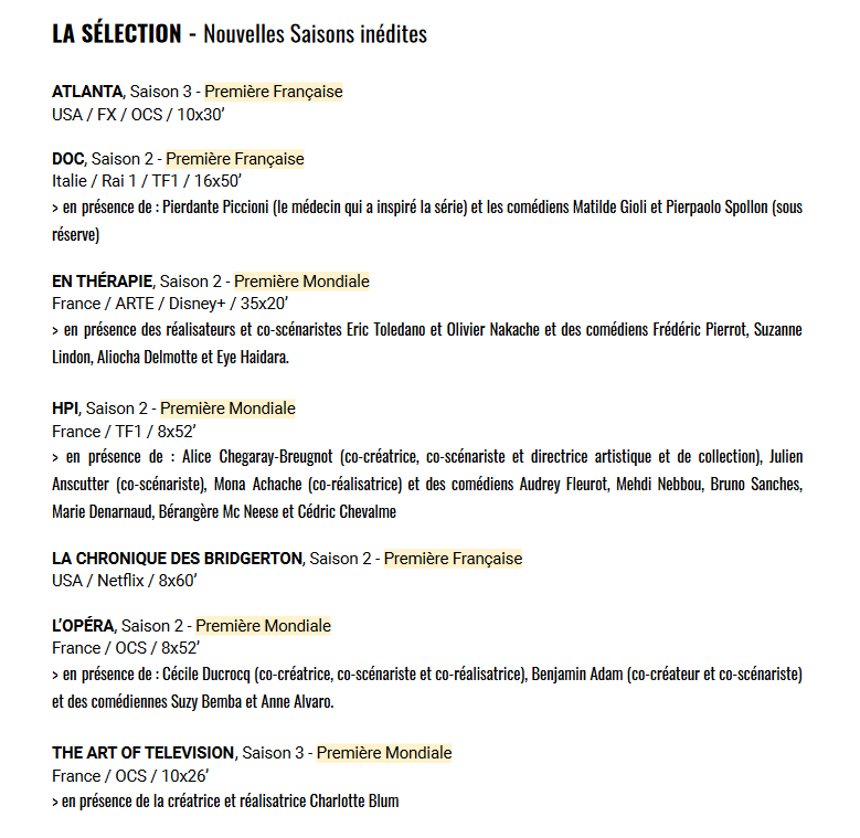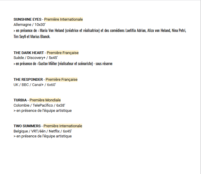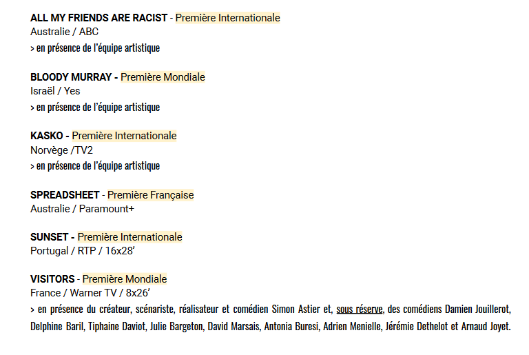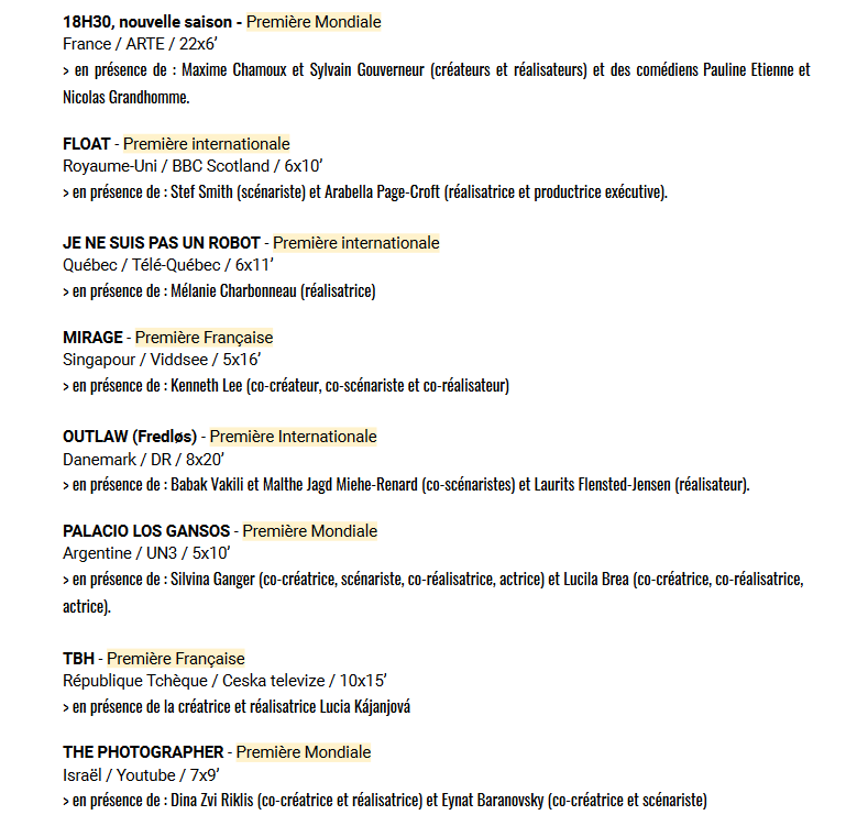13 séries – 10 pays représentés : Israël, Belgique, Allemagne, Chine, Irlande, Canada, UK, USA, Suède, Colombie.