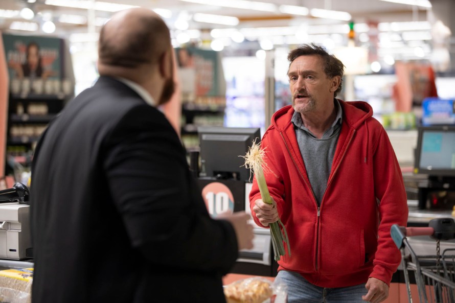 Mais sur 1H23 … ça ne tient pas… Il manque les délires foisonnants certes mais également un récit empathique ou à minima solidement ancré dans une outrance décalée …. Pire encore, le passage sur grand écran réussit le tour de force d’asphyxier un humour qui porte pourtant des germes de bouffées délirantes corrosives. Au final, c’est comme une même blague plutôt très drôle au début, mais que vous racontez pendant une heure 20… Dans l’absolu, la durée du film est d’ailleurs courte… Comme si au montage, il avait été estimé que le trop plein de Fabcaro créait le vide d’autre chose et un sentiment d’ennui qui ne pouvait durer que peu de temps, 1H23 étant donc comme la durée maximale. La dénonciation satirique si elle est une noble aspiration ne prend pas d’avantage, entre le mercantilisme effréné au regard de l’oubli par Fabrice (Jean-Paul Rouve) de sa carte de fidélité qui fait tout un coup de lui une sorte de Jacques Mesrine du 21ème siècle ou du journaliste de la chaîne info qui fait répéter à des passants déphasés de passer à la télé, le message éditorial délétère sécuritaire que le chaîne veut promouvoir. Ce type d’humour irrévérencieux et presque subversif dans l’accusation de nos dérives contemporaines est alléchant sur le papier. Mais ce sujet a été tellement épuisé qu’il mérite forcément un traitement en dentelle pour générer une impression de renouvellement. Or, ici, c’est tout l’inverse qui s’opère, et même qui s’aggrave à mesure que le film avance. Quand précisément, on apprécie l’humour corrosif, incisif et hyper décalé de l’univers de Fabacaro, l’omniprésence de ces silences qui est le paroxysme du plaisir dans l’absurde, que l’on est attaché à un Jean-Paul Rouve qui a su fréquemment nous faire hurler de rire… Ce sont pour toutes ces raisons que nous sommes en droit d’être grièvement déçus, face à ce qui ressemble gentiment à un accident industriel.