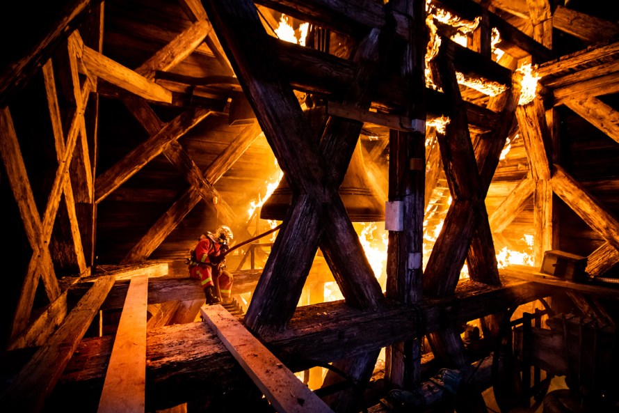 La puissance des images est magistrale, et la technicité filmique déployée est ici totale. Les vues de Paris, les panoramiques, les travellings à en perdre la tête, les alternances d’images d’archives avec la combinaison de la grandiose reconstitution donnent cette incroyable et spectaculaire impression de vérité. D’ailleurs, « tout est vrai » comme le dit partout Jean-Jacques Annaud. Notamment cette Invraisemblable accumulations d’embûches, avec les folies urbaines de la capitale (bouchons, travaux, effets de masse…) qui sont venues entraver le sauvetage et qui aurait du inexorablement aboutir à l’effondrement de la cathédrale. Effondrement, qui lui-même aurait généré de par les émanations qui allaient avec, un incendie géant dans toute l’ile de la cité. Cette reconstitution au millimètre n’est pas sans rappeler la minutie absolue utilisé par James Cameron dans Titanic (1998). Un même sens du détail que l’on retrouve dans la chronologie de la dramaturgie, avec toutes ces insignifiances qui deviennent finalement malgré eux historiques… Les petites histoires qui font exister la grande, avec tous ces tiroirs donnent encore plus de force et d’authenticité au film. Pour la conception de son œuvre, le réalisateur a reçu quasi 20 000 vidéos de Notre Dame qui brûle. Pour l’écroulement intérieur de la voute, il vous explique comme un gamin de 6 ans qui monterait son œuf Kinder, qu’il a suffi de tout reconstituer à l’identique et faire ensuite s’effondrer 75 mètres cubes de poutres et autre. Parfois au grand désespoir des équipes techniques du film : « Un an de fabrication de décors pour ensuite tous les cramer… » Jean Jacques Annaud joue avec le feu, et il ne le fait pas à moitié. Les images de la voute, sont comme une effroyable parabole des flammes de l’enfer qui pénètrent au cœur même de la cathédrale.