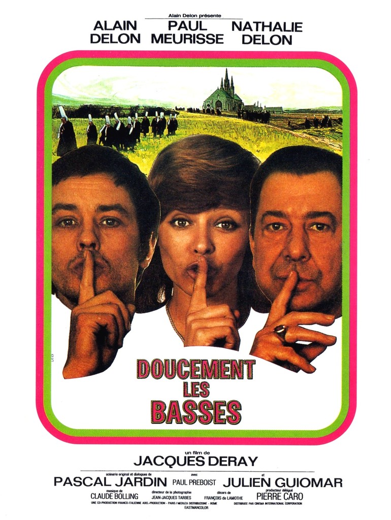 Après deux grands succès commerciaux, Delon et Deray vont se risquer dans le bizarre avec cette comédie qui détonne complétement dans leur filmographie respective. Ici, Delon joue un prêtre qui voit réapparaitre son ex-épouse prête à se donner à qui veut s’il ne la reprend pas. Delon cabotine, Deray n’est clairement pas à l’aise dans sa mise en scène, l’écriture de Pascal Jardin n’est pas la plus inspirée, bref on pourrait se demander ce que ce petit monde est venu faire dans cette galère. L’explication est assez simple. Clairement, Delon veut casser son image trop sérieuse et prouver qu’il sait évoluer dans un registre où on ne l’attend pas. Pour cela, il va logiquement chercher celui qui est devenu son metteur en scène de prédilection, donne un rôle à Nathalie Delon, son ex-femme et partenaire du film de Melville Le samouraï, et nous concocte ce Doucement les basses que le public va bouder. Deray a répondu à l’appel de son ami avec l’envie de se frotter à un genre qui lui faisait de l’œil mais il ne s’y reprendra plus par la suite. Doucement les basses se fera doucement oublier, devenant presque invisible sur nos écrans. La restauration récente faite par Pathé va-t-elle le ressusciter ? Pas sûr, en tout cas il reste une curiosité.