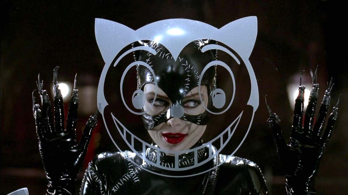 Danny DeVito qui s’éclate visiblement sous des tonnes de maquillage (signé du studio de Stan Winston), dévorant chaque scène, grinçant de ses dents noirâtres, fait du Pingouin un monstre sympathique : horrible en apparence, grossier et corrompu par nature mais néanmoins une figure tragique. Oswald Cobblepot reconnaît d’ailleurs dans son ennemi juré une âme sœur. N’est il pas une autre version de Wayne difforme, abandonné au lieu d’être orphelin ? L’autre (et authentique) méchant du film Max Schreck est également une image déformée de Batman – un millionnaire utilisant sa fortune pour nuire aux habitants de Gotham plutôt que de les protéger. Christopher Walken, -à son plus Walkenesque – avec sa perruque grise et son étrange diction imprègne l’odieux Shreck d’une malfaisance théâtrale. Michelle Pfeiffer, qui a décroché le rôle après le forfait d’Annette Bening (tombée enceinte peu avant le tournage) livre une des grandes performances d’actrice de la décennie, déterminante pour sa carrière dans le rôle de Catwoman, une des plus iconiques des Comic Book Movie . Elle compose une figure inoubliable en talons hauts dans une tenue SM de cuir et de latex naviguant entre l’anti-héroïne et la méchante. Elle passe de « demoiselle en détresse » à « femme fatale » de manière si naturelle et avec un tel charisme qu’on ne remet jamais question le fait que Batman ait rencontré son égal. Elle incarne toute la fureur des femmes maltraitées, en guerre contre les exploiteurs sexistes de Gotham (un message qui n’a rien perdu de sa pertinence) . Mais Pfeiffer convoque également le désespoir d’une véritable crise d’identité que traverse son personnage. On peut voir quelque chose d’un message message subliminal adressé par Burton à la major dans la façon dont Catwoman ravage le grand magasin Shreck qui vend des mensonges commerciaux . Contrairement à Bruce Wayne, Selina Kyle trouve une libération dans son identité costumée et c’est ce qui l’attire immédiatement chez elle. A sa manière, Batman Returns parvient à faire passer une véritable relation adulte dans un film de super-héros aidé par la chimie du couple Keaton/ Pfeiffer. La romance entre Wayne et Selina Kyle – à la fois dans et hors de leurs costumes – s’avère étonnamment poignante, celle de deux amants clairement destinés à être ensemble mais qui ne pourront jamais l’être vraiment. Burton y met une touche d’Ernst Lubitsch et de screwball comedy les deux personnages dissimulant leur double vie, leurs identités secrètes et leurs cicatrices lors d’un câlin au coin du feu. Alors que les affiches de Batman Returns laissaient imaginer un combat acharné entre la chauve-souris, le chat et le pingouin, le film s’avère beaucoup plus sympathique dans sa représentation des trois piliers de DC Comics. Batman Returns s’inscrit parfaitement dans la filmographie de Tim Burton et sa célébration des personnages bizarres et des parias de Pee-wee Herman et Edward Scissorhands à Jack Skellington et Ed Wood. Il montre tout autant ce qui unit le trio que ce qui le divise, en particulier le pouvoir qu’ils trouvent dans leurs identités secrètes. La tragédie ultime de Batman Returns est que le chevalier noir ne peut finalement sauver aucune de ces âmes solitaires, quand vient le générique de fin, Bruce retourne à son existence solitaire dans ce manoir aux allures de château à la périphérie de la ville – tel un monstre de la Universal condamné à la solitude.
