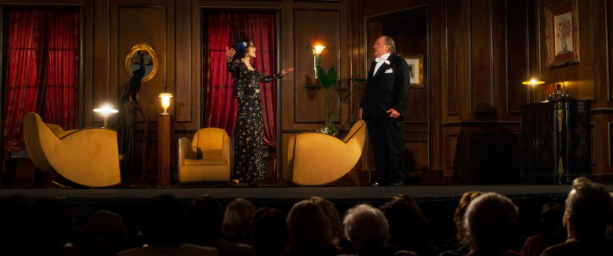 Le plaisir de voir Depardieu constamment à l’écran est pour autant évident. C’est tout le lien aux autres de son personnage Jules Maugin qui est ici déployé, avec Félix, mais aussi avec celle qu’il va prendre sous son aile, Alice (la délicieuse Stéfi Celma), ainsi que Maria (Anouk Grinberg), qui est un peu son bouffon du roi, la seule qui peut tout lui dire, lui rentrer dedans et tout se permettre, et bien sûr son histoire avec Jeanne Swann (Fanny Ardant). Histoire touchante que malheureusement on ne fait que trop effleurer, deviner, et qui contient trop d’ellipses. Si on devine l’intentionnalité du charme discret et les brûlures du non-dit, un peu plus du magnétisme Ardant-Depardieu n’aurait vraiment pas nuit. Les volets verts, c’est aussi filmer le jeu, et qu’il est intéressant de voir qu’au théâtre si pour le public, différent chaque soir, mais qui rit évidemment aux mêmes tirades, du prisme des comédiens, c’est par moment une source d’inépuisable lassitude, la représentation permanente. Passionnant évidemment.