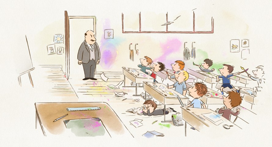 Et puis, il y a les copains… Alceste qui mange tout le temps, Eudes et Rufus qui se battent parfois, Geoffroy déguisé en martien, Clotaire qui est très maladroit, Maixent et ses grandes jambes et les genoux sales, Joachim le rêveur qui confond sa droite et sa gauche et Agnan, mais qui est pas vraiment un copain. Et même il y a des filles !!!! « Non mais ça va pas la tête, t’es en train dessiner une fille » s’indignera Nicolas à Sempé. « Car moi, je n’aime pas les filles, c’est bête, ça ne sait pas jouer à autre chose qu’à la poupée et à la marchande et ça pleure tout le temps !! » Sauf que quand il s’agit de Louisette ou Marie-Edwige, Nicolas et ses petits potes n’auront de cesse que de vouloir les impressionner, leur en mettre plein la vue. Un peu l’histoire de la vie finalement. Et puis, il y a aussi la maitresse… Jolie et drôle, histoire d’être sages, pour avoir envie de pas la fatiguer. Pis à l’école il y a aussi le surveillant, surnommé pauvre de lui le Bouillon… Qui voit toujours les tas de sables et de feuilles disparaître, c’est toute une histoire. Et des comme ça, il n’en manque pas dans Le petit Nicolas – qu’est-ce qu’on attend pour être heureux ? Le bouillon ça sera un peu comme Hector Duval, le prof de gymnastique à la colo, ces adultes qu’on aime bien embêter.