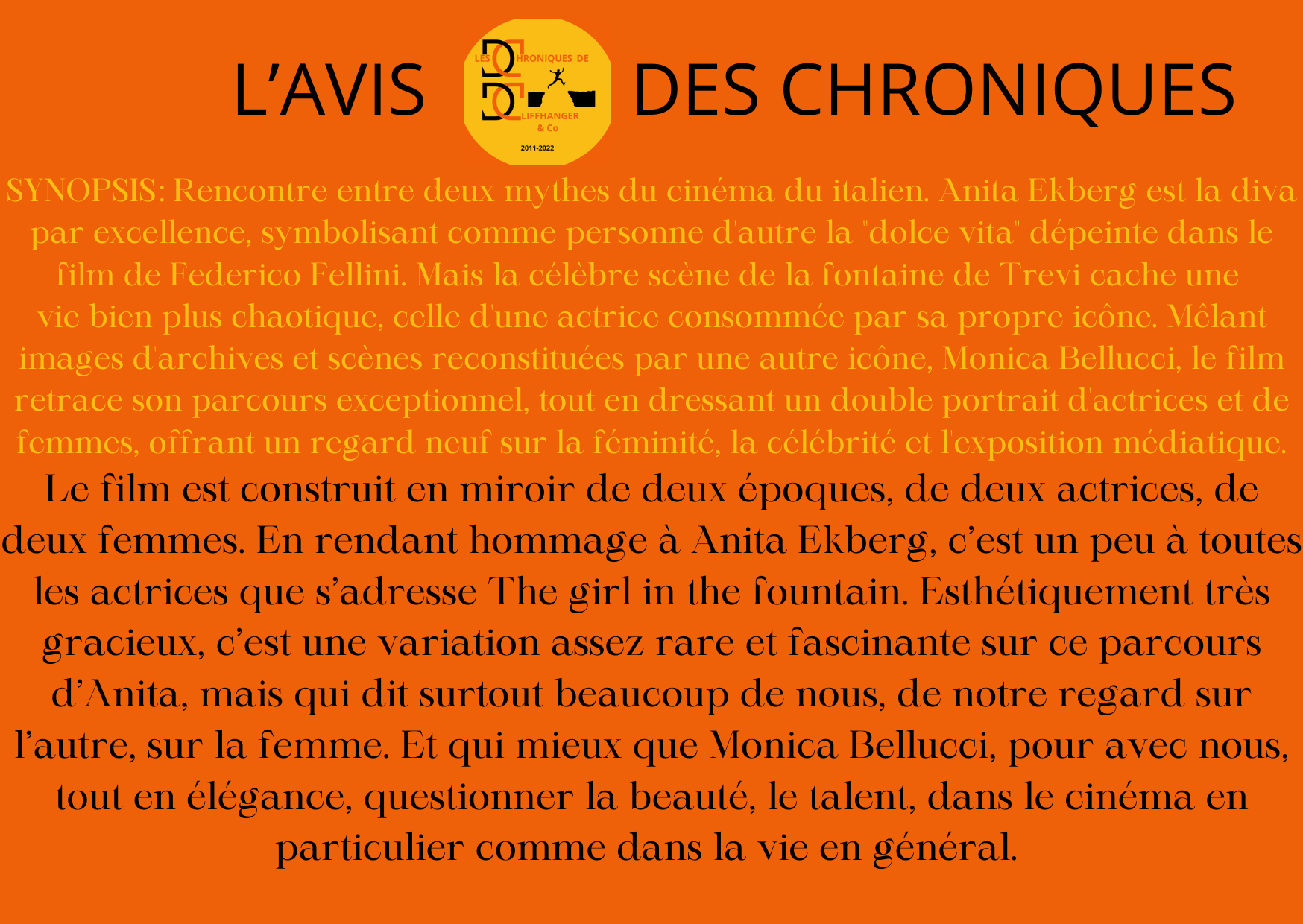 Monica Bellucci : En effet, cette femme, elle avait un courage hors normes. Aujourd’hui c’est facile de partir de l’Italie ou d’un autre pays, de partir à l’aventure, mais à cette époque, c’était autre chose. Elle était super jeune, elle est allée en Amérique, elle a appris l’anglais, elle est venue en Italie, elle a appris l’Italien. Et quand elle est arrivée, elle avait quand même eu le Golden Globe « Star of the year ». Après, elle a fait La Dolce Vita et est devenue une star internationale. Mais cette liberté, elle l’a payée très cher. Aussi car c’était une époque où on ne pouvait pas être libre comme ça. Et ce qui est intéressant dans The Girl in the fountain, c’est la comparaison entre deux époques. Le star system de l’Italie après la guerre et celui d’aujourd’hui, et entre les femmes de l’époque et les femmes d’aujourd’hui. C’est deux vies en confrontation. Le problème de l’époque c’est que l’image et la personne, c’était la même chose. Quand elle sortait, elle dansait sur les tables, elle faisait la Dolce Vita. C’était très risqué, et je pense qu’elle est tombée dans ce piège. Elle est aussi arrivée dans une époque où en Italie, c’était le plus fort moment artistique qu’on a connu. Il y avait tous les plus grands metteurs en scène, mais il y avait des diktats précis. Après un certain âge, c’était impossible de continuer à travailler. Tu pouvais avoir tout le talent que tu voulais, ta carrière était liée à un moment biologique. Ce film est important aussi car ça raconte un moment magnifique du cinéma, où il y avait des lois très dures pour les femmes. Moi à mon âge, ça aurait fait 20 ans que je n’aurai plus travaillé.