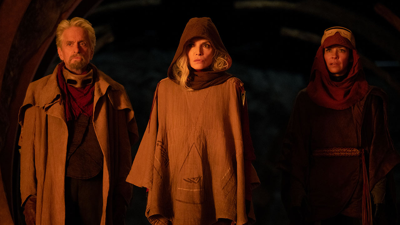 Ant-Man & La Guêpe : Quantumania souffre d’un problème d’identité car les deux précédents films avaient pour particularité de se dérouler en marge des grands évènements du MCU, leur intérêt résidant dans la dynamique des relations entre ses personnages plutôt que dans des conflits super-héroïques. Cette dynamique familiale ou amicale était mise en mouvement par une série de problèmes à résoudre plutôt que de combats à mener pour la survie de l’humanité ou du multivers. L’action s’y déroulait dans le « monde réel » et les seconds rôles, le groupe de bras cassés qui entouraient Scott Lang contribuait à l’identité de la franchise. Ce charme comique manque à ce troisième volet dont l’action se déroule quasi exclusivement dans des environnements numériques. Si les enjeux sont clairs (et massifs) ils sont tous externes au noyau familial ou amical des Lang. La motivation émotionnelle et les enjeux personnels sont quasiment absent sauf pour le personnage de Janet Van Dyne incarnée par Michelle Pfeiffer. En renonçant aux jeux d’échelle qui faisait le charme des pouvoirs du personnage le film perd aussi de ce qui faisait sa spécificité pour devenir une aventure cosmique où Scott Lang n’est finalement pas indispensable. L’ouverture du film tente d’établir les relations compliquées entre Scott et sa fille Cassie (Kathryn Newton) désormais adolescente, conséquences de l’absence de Scott durant cinq ans et de la volonté de cette dernière de devenir une héroïne alors que Scott se satisfait de sa nouvelle vie. Toutes ces pistes se volatilisent dés qu’ils entrent dans le royaume quantique.