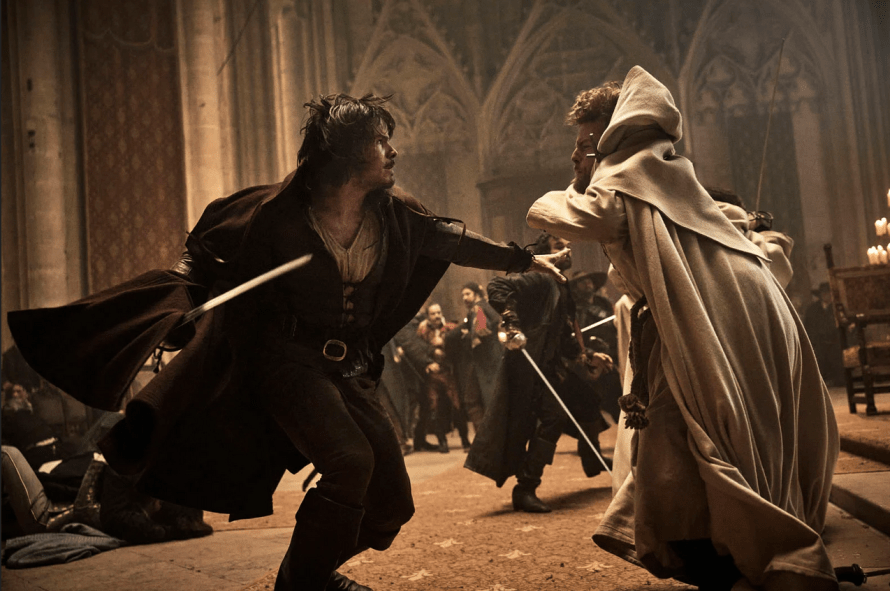 180 ans après, et suite à 43 films qui ont narré leurs aventures, voilà la tentative audacieuse en 2023 de Martin Bourboulon, réalisateur de l’hilarant Papa ou maman (2015) et plus récemment du, là aussi grand projet, Eiffel (2020). Le cinéaste insiste sur l’expérience de la salle pour des films d’envergure, en occupant avec légitimité l’espace de la technique et de la grande flamboyance du cinéma, pour ne pas complètement l’abandonner à d’autres continents. Forcément, c’est la grosse débauche d’énergie. On est incontestablement dans le domaine du grand spectacle et il faudrait être bien mauvais payeur pour ne pas souligner les multiples prouesses techniques, les effets, le souci minutieux de reconstitution, le travail impressionnant sur les costumes et le réalisme des combats. L’ensemble est clairement agréable et divertissant, l’énergie est constante et même assez contagieuse. Pour les scènes d’actions, le réalisateur évoque une » immersivité » pour être au contact des émotions des protagonistes. Clairement, cette volonté est flagrante et se traduit par une vraie patte, un style dans le rythme des plans séquences, qui se focalisent souvent sur les visages. Les trois mousquetaires c’est 160 décors tous très authentiques. « Le bon décor est celui qui ne se voit pas » dira Stéphane Taillasson qui a orchestré l’ensemble, s’appuyant sur des références comme Cyrano de Bergerac (1990) ou La Reine Margot (1993).