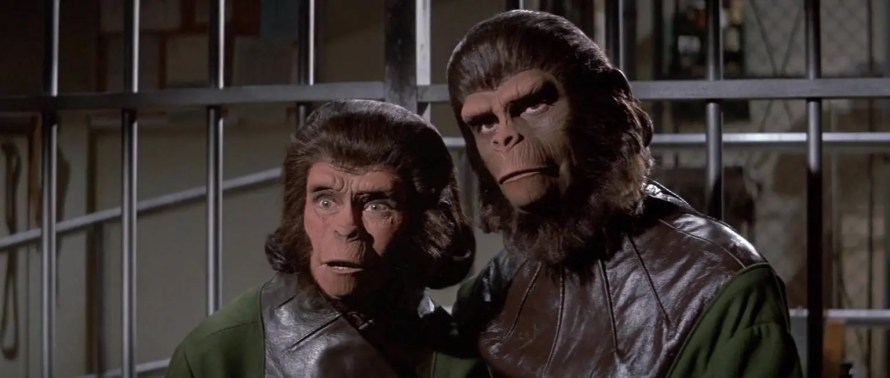 Il s’agit ici d’un retour du futur car contrairement aux deux premiers volets, on ne parle plus de voyage en 3978, mais un retour à la réalité en 1973. La première scène est similaire aux deux premiers volets, elle s’ouvre avec un vaisseau spatial découvert à la dérive dans les eaux au large de la côte californienne. Mais ce coup-ci ce ne sont pas trois humains mais trois singes qui en ressortent. Nous avons la bonne surprise de voir arriver en 1973, Zira (Kim Hunter), Cornelius (Roddy McDowall, de retour après son absence remarquée dans le deuxième épisode) et Milo (Sal Mineo pour son dernier rôle au cinéma). On apprendra par la suite qu’ils ont réussi à échapper à la destruction de leur monde (la bombe nucléaire du 2ème volet) en empruntant le vaisseau spatial de Taylor.