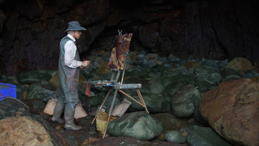 Pour y parvenir, Schroeder dévoile une mise en scène extrêmement sobre, acceptant la présence de sa caméra ou de ses techniciens dans le champ, permettant au public de s’immiscer dans l’univers capté par le film, que ce soit dans l’atelier surchargé de Cavallo, dans son ancienne chambre étudiante, au cœur des grottes qu’il peint avec attention ou lors d’un cours de dessin donné aux jeunes du village. Ricardo et la Peinture saisit alors l’opportunité de rendre son parcours extrêmement didactique, sans avoir l’impression d’être devant une leçon ou au milieu d’un énième documentaire rébarbatif. Schroeder, par la proximité qu’il entretient avec son héros presque ordinaire, extrait de lui la passion de la peinture, par une érudition à toute épreuve et un appétit esthétique saisissant. Le travail de l’artiste devient alors la toile de fond du long-métrage, puisant dans ses séquences d’artisanat à la fois l’intérêt formel du mouvement, mais aussi le rapport de son peintre à la nature et au monde extérieur. Les effluves humanistes dégagées par le documentaire contribuent à en faire un objet précis, pas vraiment une biographie, pas vraiment un essai, pas vraiment une performance. La mise en scène enlevée, sobre, couplée avec le rythme tranquille calé sur le quotidien de sa tête d’affiche, permet de faire de Ricardo et la Peinture une ébauche délicatement sublime des réflexes philosophiques et des questions existentielles qui agitent l’Homme. Pour être plus concret, le film accompagne la vie et les processus de fabrication de l’art de Ricardo Cavallo pour en sortir plus qu’une représentation plan-plan : une véritable reconstitution à l’écran de l’univers d’un peintre qu’on prend plaisir à suivre, à écouter, à voir travailler et à découvrir les étranges habitudes routinières. Les décors bretons dans lesquels le film nous emmène ajoute une dimension naturaliste, semblant répondre aux questions de son singulier protagoniste, très discret mais pourtant intelligemment bavard.