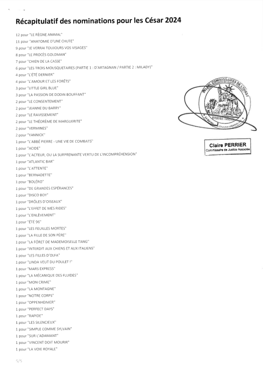 La 49ème cérémonie des César aura lieu le 23 février prochain et les nominations ont été annoncées ce mercredi. La cérémonie qui sera présidée par la comédienne et réalisatrice Valérie Lemercier en direct de l’Olympia. L’an dernier c’est le film de Dominik Moll, La nuit du 12 qui avait rallié le plus de suffrages. Cette année, c’est Le règne animal qui arrive en tête des nominations avec 12 citations suivi de près d’Anatomie d’une chute (11), la Palme d’Or du dernier Festival de Cannes qui vient également d’être nommé à cinq reprises pour les prochains Oscars. Je verrai toujours vos visages (9), Le procès Goldman (8), Chien de la casse (7) ou le diptyque Les trois mousquetaires (6) seront parmi les challengers les plus attendus.
