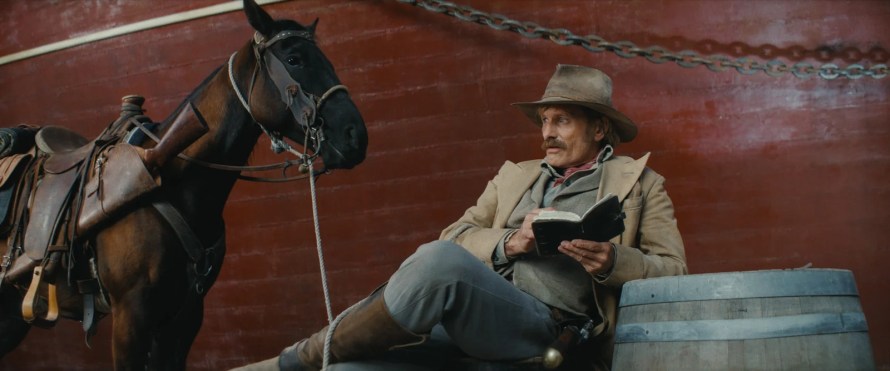 Après un début tonitruant où les morts s’accumulent rapidement, le film bascule dans un rythme plus platonique oscillant entre drame et pur western. La violence et la tragédie sont la direction naturelle de l’histoire, cette trajectoire est claire dans chaque scène et chaque plan et malgré cela Mortensen arrive à mettre l’accent sur le côté calme et doux de nos deux protagonistes qui arrivent à s’intégrer dans ce monde cynique et violent. A travers ce paysage brutal, l’amour d’Olsen et Vivienne s’épanouit comme une fleur miraculeuse. Viggo Mortensen incarne ici un homme traditionnel, fort et silencieux, un héros occidental de la vieille école mais la véritable tête d’affiche c’est bien Vicky Krieps, celle que le réalisateur a toujours voulu comme il le dit si bien : « Je ne pouvais imaginer quelqu’un de meilleur dans ce rôle que Vicky Krieps, et nous étions très heureux lorsqu’elle m’a dit qu’elle aimait le personnage et qu’elle voulait le jouer« . En lui laissant les rênes du film alors qu’il se retire au milieu du film, il lui offre la possibilité, (qu’elle saisit largement) de montrer son authenticité et sa force tranquille, tout en livrant un personnage puissant. Le choix de montrer Vivienne seule pendant l’absence de son mari nous permet de voir comment elle gère cela, c’est très judicieux et c’est exactement ce que recherchait le réalisateur : « Je voulais explorer ce qui arrive aux femmes qui sont laissées derrière lorsque leurs pères, maris ou fils partent mener leurs guerres masculines. Et ce que ressentent et pensent les femmes comme Vivienne ».