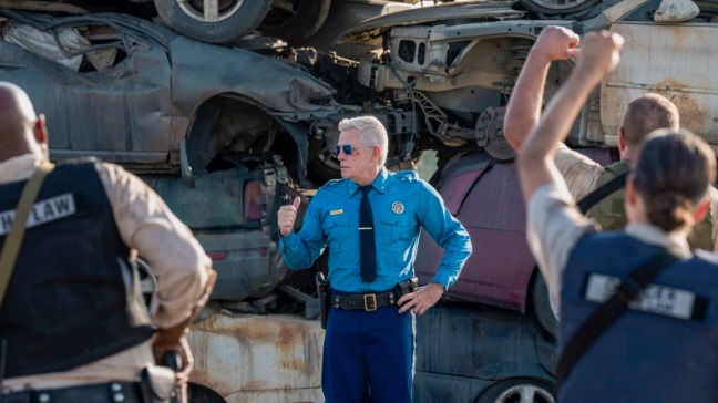 Dans l’esprit, indépendamment du côté post-apo du show, Twisted Metal nous a beaucoup fait penser à des séries comme Ash vs. Evil Dead ou Happy! Violence décomplexée, personnages psychopathes et sociopathes extrêmement violents, univers sale, sanglant et sans pitié saupoudré de drames et d’une bonne dose d’humour qui allège totalement la gravité de ce qui s’y passe, avec un budget limité qui fait cependant de son mieux pour nous offrir un univers vaste, riche et crédible, la série s’ancre dès lors dans la même veine délirante. Le premier épisode pose bien les bases de la saison mais peut faire un peu peur. En effet, sans être encore rentrés dans le délire promis, nous craignions d’assister à un spectacle cheap qui cale en début de route. Il n’en est rien. Twisted Metal a plusieurs cordes à son arc et beaucoup de personnages hauts en couleurs à dévoiler. Nous nous sommes vite pris au jeu et avons dévoré les 10 épisodes d’une traite. Ce que nous avons préféré dans Twisted Metal c’est cette facilité avec laquelle le show nous dévoile les nouvelles normes d’un monde qui est tombé tout en réussissant à nous dépayser comme certains Mad Max avaient jadis réussi à le faire. On découvre ainsi divers autochtones, et divers patelins qui obéissent tous à des règles différentes (petite pensée pour la ville où les habitants portent des bijoux en peaux humaines). Qu’il s’agisse des costumes, des véhicules, des rites ou des pétages de câble de chacun, la série s’en donne à cœur joie.