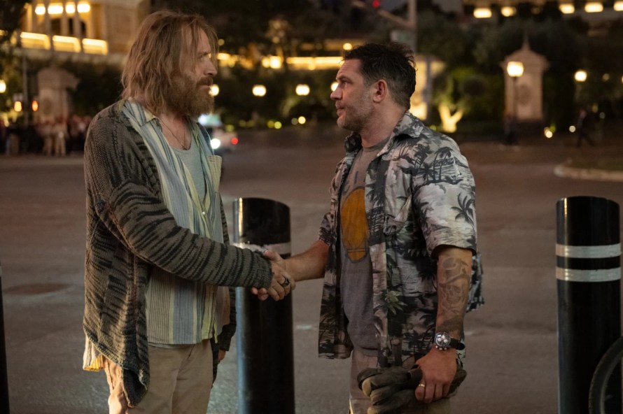 Après le second film du Joker, le troisième (et dernier) volet de Venom vient nous confirmer que la période est à priori dédiée à l’art du troll. Au moins dans le cas de Venom nous n’aurons pas attendu l’arrivée de ce nouvel opus pour nous en rendre compte. Tom Hardy revient donc dans la peau d’Eddie Brock, toujours plus ridiculisé de film en film via cette fois un accoutrement de touriste allemand qu’il arbore presque fièrement. Sans comprendre vraiment quels génies du mal pilotent cet univers, Sony, ni ce qu’ils proposent comme cahier des charges pour que le tout soit aussi uniforme dans son exécution, force est de constater que les Venom, Morbius et autre Madame Web ne sont ni plus ni moins que des enfants pétés de thunes qui ont pourtant l’esprit et parfois l’aspect d’une série B de luxe. Cet aspect éclaté au sol avait dans Venom : Let There Be Carnage pris une tournure plutôt réjouissante puisque le film, tout à fait conscient d’être complètement claqué, en jouait très honnêtement, offrant quelques délires savoureux qui ont fait qu’en sortant de la séance nous avions plutôt adhéré à ce Venom 2 (juste pour la perruque de Woody Harrelson cela valait le détour). C’est donc confiants que nous allions voir cette suite qui allait achever, nous l’espérions, cette saga née dans la douleur, dans un joyeux délire nanardesque. Loupé, même pour sa conclusion la saga se sera vautrée.