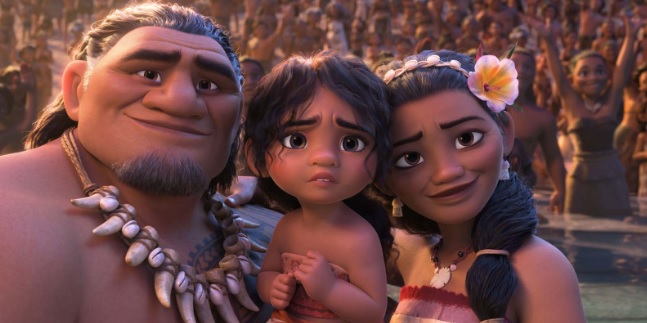 Au-delà de cette histoire un peu faible, qui compense comme elle peut sa narration et ses tares par un apport de nouveautés, tributaires d’une mécanique tantôt similaire au premier film, tantôt dans l’émancipation, on reste un peu circonspects devant tous les personnages humains (et demi-dieu) du film qui sont assez bien caractérisés mais trop en retrait pour marquer les esprits (on n’a paradoxalement pas forcément envie de les voir développés pour autant car on sent qu’ils deviendraient aisément agaçants). En revoyant le premier Vaiana nous étions amusés de redécouvrir les punchlines de Maui, souvent irrévérencieux, nous demandant même si le premier volet sortait en 2024 et non en 2016, dans quelle proportion la subtilité de l’écriture en serait modifiée. Nous avons rapidement eu la réponse : même si Maui est ici toujours aussi agréable à suivre, il est aussi et surtout complètement effacé et aseptisé. Terminé l’aspect no limit de sa verve, le demi-dieu est maintenant soit absent (physiquement parlant), soit en retrait, soit plutôt sentimentaliste. Ce n’est pas un problème sur le papier puisque cela dénote une certaine évolution de sa part, mais la teneur de ses vannes a réellement changé. Après tout qu’attendre d’autre de Disney en 2024 ? On aurait préféré que le scénario privilégie Maui par rapport aux autres seconds couteaux. Outre Maui on découvre donc plein de nouveaux personnages comme la petite sœur beaucoup trop mignonne de Vaina (ils ont réussi leur coup) et cet équipage en bonne et due forme que nous évoquions car cette fois Vaiana ne partira pas seule. Une équipe qui pourrait vaguement rappeler celle du film Buzz l’éclair de 2022 qui affichait un fort capital sympathie mais sur laquelle l’histoire n’avait pas réellement le temps de s’attarder ; on sent à contrario que ceux de Vaiana 2 ont un intérêt véritablement plafonné et presque aucun intérêt à être développés au-delà du cliché qu’ils représentent ce qui est peut-être quelque part une forme d’échec dans leur conception et ce qu’ils dégagent. Quid alors des chansons ? Le niveau est ici aussi en deçà, le film ne réussissant jamais à atteindre le point culminant d’un morceau comme L’explorateur (là encore le film en est très conscient puisqu’il réutilise le morceau remixé) mais il faut être fair-play : il y a de bons morceaux. On pense notamment à l’enivrant Invente ta rout« , l’entêtant Aller plus loin » ou encore l’épique Je vais avoir un chee-hoo ? Nous estimons le pari musical plutôt réussi même si cela manque sans aucun doute d’un hit véritablement puissant avec une aura forte.