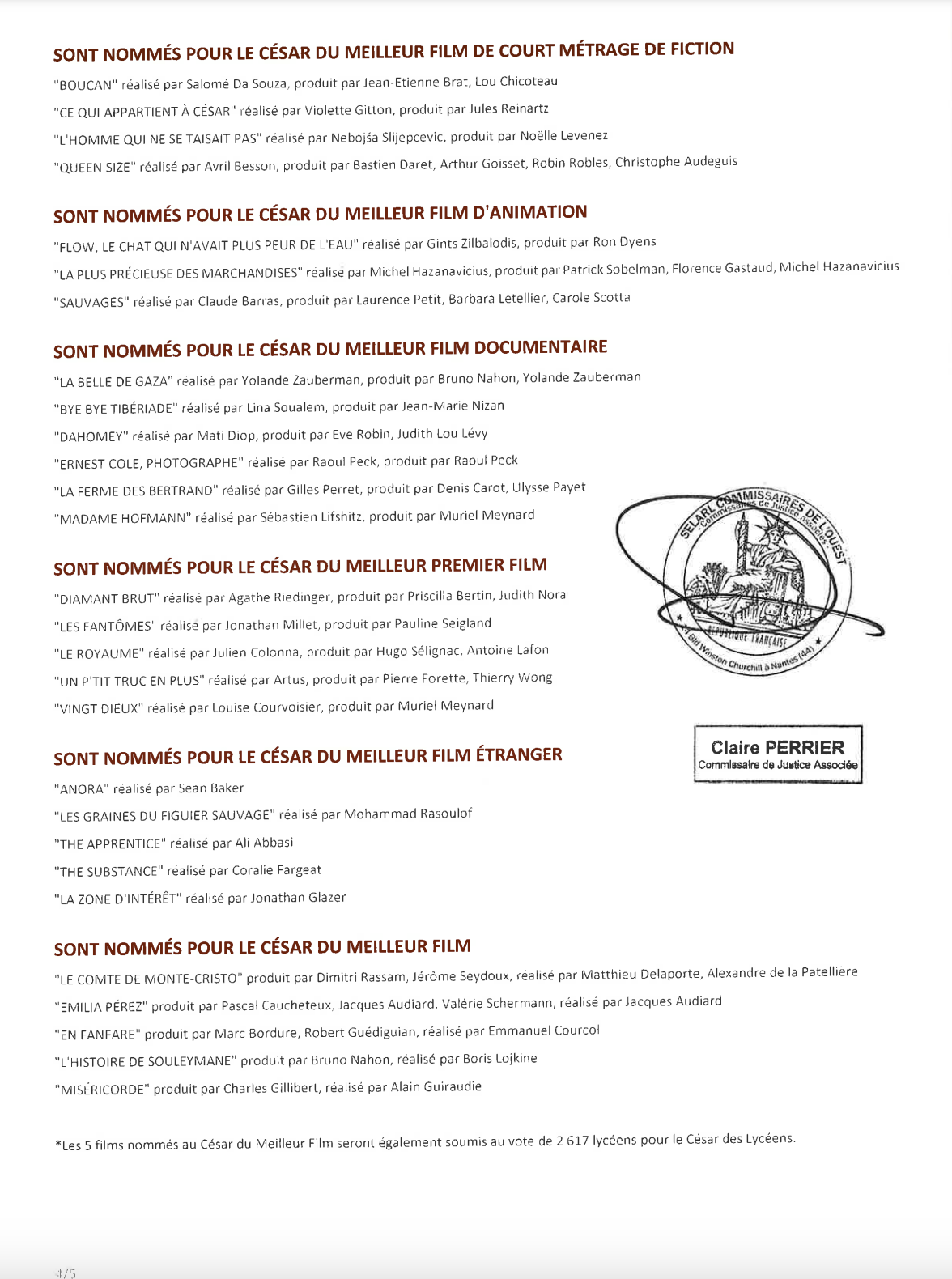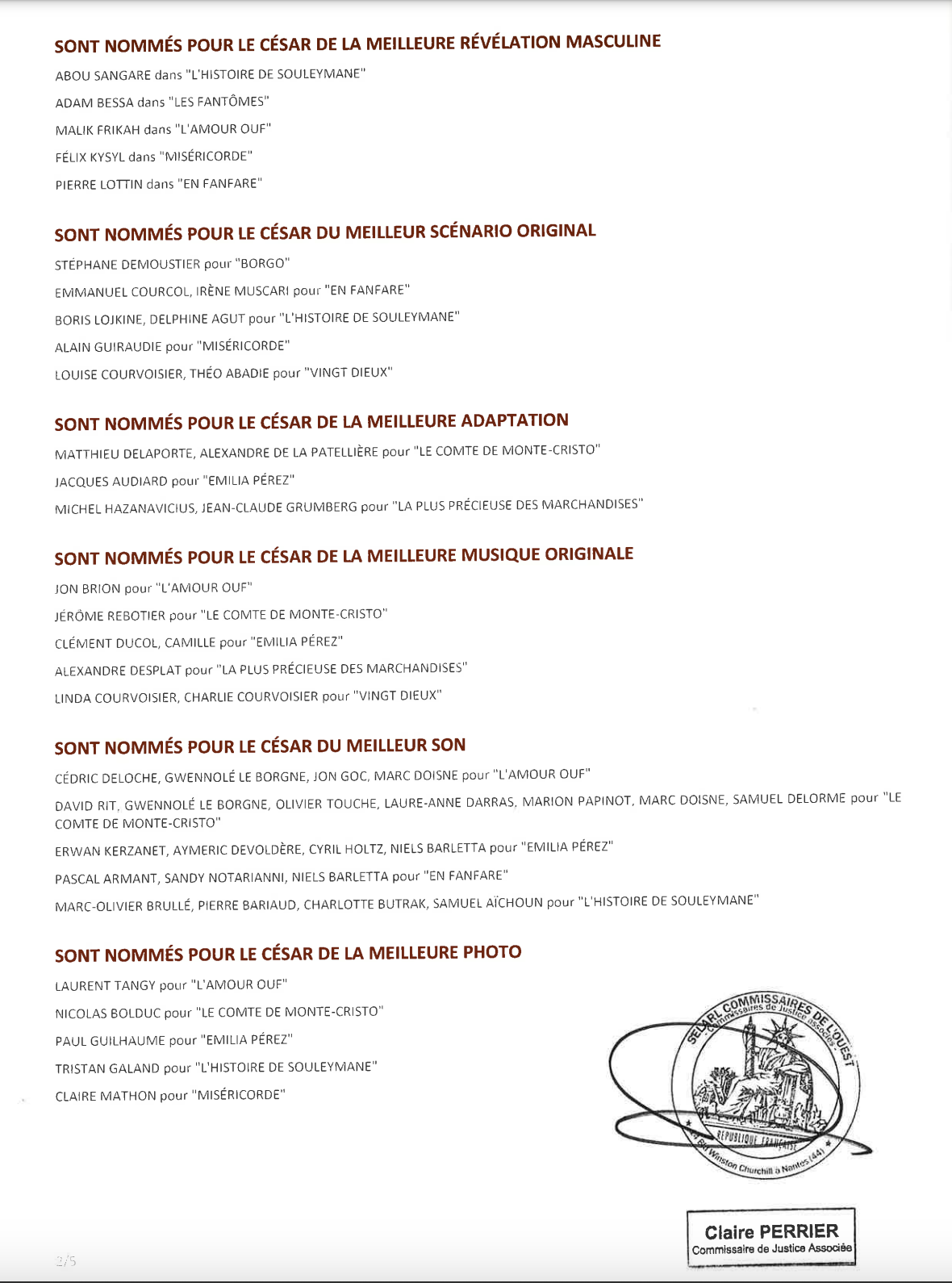 La 50ème cérémonie des César aura lieu le 28 février prochain à l’Olympia et les nominations ont été annoncées ce mercredi. La cérémonie sera présidée par la comédienne Catherine Deneuve et animée comme l’an passé par plusieurs artistes menés par Jean-Pascal Zadi dont Emmanuelle Béart, Alice Belaïdi, Cécile de France, Hafsia Herzi, Bouli Lanners, William Lebghil, Vincent Macaigne ou Pio Marmaï. L’an dernier Anatomie d’une chute et Le règne animal avaient trusté le plus de récompenses, 6 pour le film de Justine Triet et 5 pour celui de Thomas Cailley, Anatomie d’une chute s’octroyant les récompenses les plus prestigieuses dont ceux de Meilleur Film et de Meilleure Réalisatrice. Sans surprise c’est Le Comte de Monte-Cristo qui obtient le plus de nominations (14), suivi par L’amour ouf (13) et Emilia Perez (12). Les outsiders L’histoire de Souleymane et Miséricorde obtiennent eux respectivement 8 nominations, talonné de près par En fanfare (7).