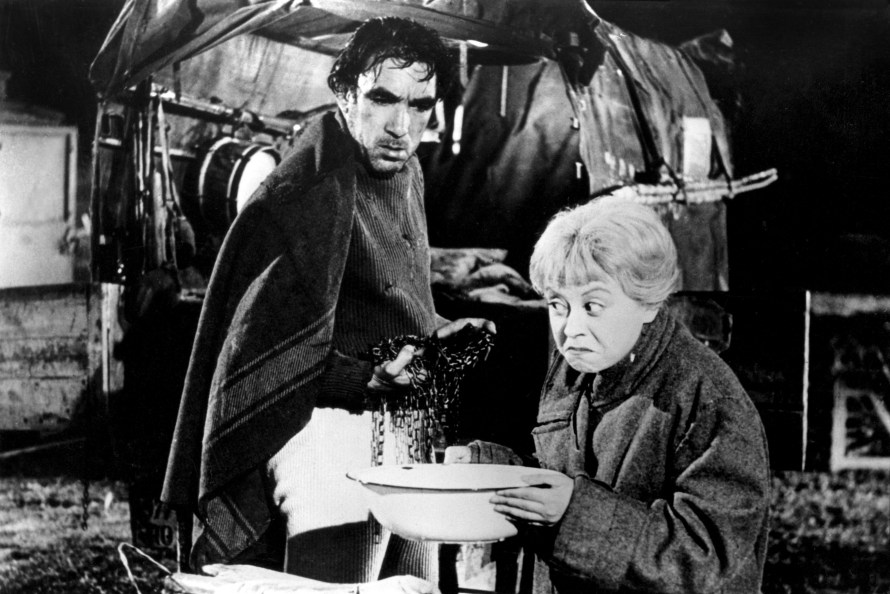 Mais la star de LA STRADA, c’est avant tout Gelsomina, pleine d’espoir, d’innocence et de naïveté, interprétée par la formidable Giulietta MASINA. Considérée comme l’un des plus grandes actrices italiennes de sa génération, son jeu d’acteur est mémorable : son visage est d’une expressivité intense, chaque mimique donnant un effet clownesque, et son sourire mélancolique reste longtemps à l’esprit. À propos de son personnage dans LA STRADA, on a souvent évoqué CHAPLIN. À ses côtés, on retrouve Anthony QUINN (Oscar du meilleur acteur pour Viva Zapata !) dans le rôle du rustre Zampano.
