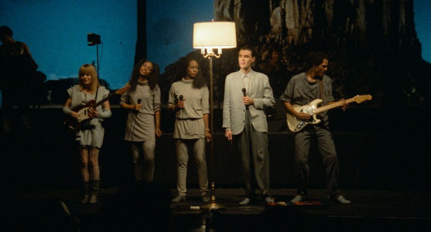 Tout commence par une scène vide. Pas d’artifice, des étagères présentent du matériel technique, la lumière est grande allumée, mais plus important : il n’y a ni instrument ni musicien. Puis entre David Byrne, un ample costume gris sur le dos, un lecteur de cassette et une guitare en main. Le show débute dans l’épure avec le morceau le plus populaire du groupe, le fameux Psycho Killer. Et, dans une étrange valse, guidée par la réalisation hypnotisante d’un Jonathan Demme en début de carrière (il n’est pas encore le metteur en scène du Silence des Agneaux et de Philadelphia), les membres du groupe vont rejoindre, un à un, Byrne sur scène. D’abord, la bassiste Tina Weymouth sur Heaven, puis le batteur Chris Frantz sur Thank you for sending me an Angel, et le quatuor est enfin au complet avec l’arrivée du guitariste et claviériste Jerry Harrison sur Found a Job. Le rythme est entraînant, parfaitement entêtant, raconté par l’énergie cathartique de sa tête de scène car dès son apparition, Byrne vole le centre de l’image. Ses yeux grands ouverts, son énergie foutraque, ses chorégraphies euphorisantes : le chanteur tape du pied frénétiquement et laisse parler l’essentiel de sa musique pendant cette heure et demie qui passe en un rien de temps.