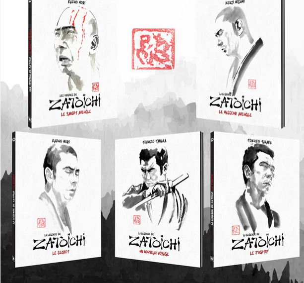 Dans ce coffret, on retrouve en premier lieu Le Bandit aveugle. Ce film de 1960 nous offre une version pré-figurative du personnage, encore plus brutal que dans les épisodes qui suivront. Il a servi à mesurer l’intérêt narratif autour d’un marginal, armé d’une épée dissimulée dans une canne, évoluant sans clan. Ce premier volet délivre l’énergie brute qui annonce une légende à venir tout en misant sur une mise en scène directe et dramatique. En revanche, le scénario est moins affiné, on ressent l’aspect prototype du film, le personnage n’est pas encore pleinement incarné dans une logique de morale. Le deuxième film, La Légende de Zatoïchi : Le masseur aveugle (1962) marque le lancement officiel de la série telle que le public la connaît aujourd’hui. Ici, Zatoïchi est introduit comme un anti-héros associant marginalité avec un sens aigu de l’honneur, dans une narration plus structurée. L’intrigue met en place la division entre justice personnelle et survie sociale, à l’intérieur d’un Japon féodal traversé de tensions. Shintarō Katsu impose une présence forte, oscillant entre humour discret et maîtrise aiguisée du sabre. Ce film est souvent considéré comme l’un des piliers d’autres grandes œuvres japonaises. Le troisième volet intitulé Zatoïchi : Le Secret, réalisé par Kazuo Mori la même année, approfondit la psychologie du héros en le ramenant sur les lieux du premier film. Le scénario développe davantage l’univers narratif, explorant des thèmes de trahison, de lutte des clans et de loyauté incertaine. L’histoire prend une tournure plus criminelle et intrigante, avec une plus grande profondeur psychologique des personnages secondaires. Ce film est plus court et rythmé, tout en intensifiant l’action avec des chorégraphies de combat améliorées et une cinématographie plus dynamique. Le quatrième film de la série, Zatoïchi : Un nouveau voyage (1963) réalisé par Tokuzo Tanaka adopte une tonalité plus introspective. Le héros revient dans son village natal oublié, ce qui donne une narration plus réfléchie et mélancolique. L’aspect pèlerin devient central, renforçant l’idée que le héros n’est pas seulement un combattant, mais un vagabond en quête de sens. Le passage à la couleur apporte une nouvelle vitalité avec des teintes vives qui contrastent avec la noirceur thématique, grâce à cela les combats sont plus stylisés et mettent en valeur les éclaboussures de sang et les paysages. Ce volet est souvent salué pour son équilibre entre action et philosophie, une réussite narrative qui le distingue de films de sabre plus linéaires. Le dernier film de ce coffret s’intitule La Légende de Zatoïchi : Le Fugitif, toujours réalisé par Tokuzo Tanaka la même année. Dans ce film, Zatoïchi est poursuivi par des yakuzas, ce qui introduit une dynamique de fuite et de survie constante. L’urgence de la fuite donne au récit un rythme effréné et une intensité dramatique qui fait contraste avec les épisodes précédents. Ce cinquième film conclut sur une note de tension maximale, offrant une synthèse des éléments narratifs et emblématiques de la saga.