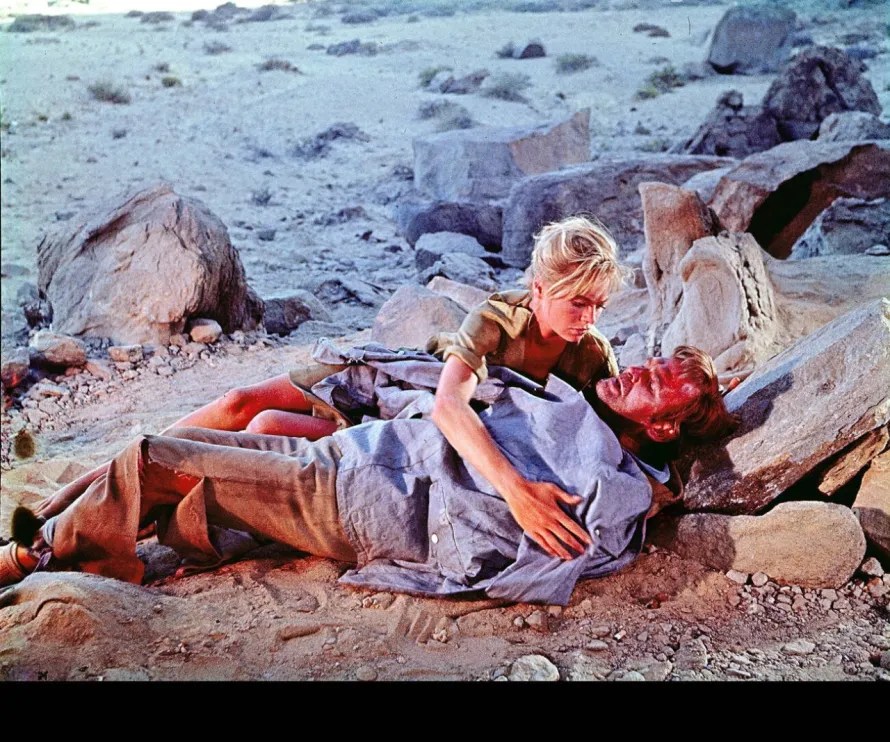 Le récit commence avec un vol charter transportant un groupe hétéroclite de passagers qui dévie de sa route à cause d’une tempête de sauterelles, menant à un crash dramatique dans une région isolée du désert du Kalahari (en Namibie actuelle). L’un des pilotes est mort et l’un des passagers, Mike Bain, est grièvement blessé. Peu après, les survivants quittent le lieu du crash. Perdus au milieu du désert aride et impitoyable, ils doivent s’organiser pour survivre. Les dynamiques de groupe se fissurent, les ressources limitées amplifient les conflits, et un leader charismatique émerge, imposant sa vision de la survie. Rapidement ils comprennent que personne ne les recherche et qu’ils vont devoir quitter le désert, sous peine d’y mourir… Au fil du temps, on apprend à les soutenir et à espérer qu’ils survivent, ou alors à les détester à cause de leur retour aux instincts les plus primitifs. Les survivants, issus de milieux divers, représentent un échantillon de la société : l’Américain individualiste (O’Brien), le Britannique pragmatique (Bain), la femme comme symbole de vulnérabilité et de résilience (Grace Munkton), le religieux (Dr Bondrachail) qui questionne la foi face à la souffrance, et les figures secondaires comme le pilote Grimmelman (Andrews) et Detiens (Davenport), qui ajoutent des nuances de loyauté et de trahison. Et ce sont bien les performances de ces 6 rescapés qui sont ici, un atout majeur, Stuart Whitman passe d’un héros charismatique à un antagoniste terrifiant, torse nu et barbu dans le rôle de l’extrémiste survivaliste O’Brien. Il est brutal, égoïste et séduisant. Stanley Baker (qui a également coproduit le film avec Endfield), apporte une gravité stoïque à Bain, rendant crédible sa lutte morale. Susannah York, qui est alors une étoile montante, a souvent été critiquée pour son rôle sous-développé. Elle incarne néanmoins une Eve complexe et difficile à cerner au premier abord. Moderne, elle est forcée de naviguer entre les alliances et les instincts de survie. Harry Andrews et Theodore Bikel ajoutent de la profondeur, avec des monologues sur la foi et le devoir qui ponctuent les moments de calme avant la tempête.